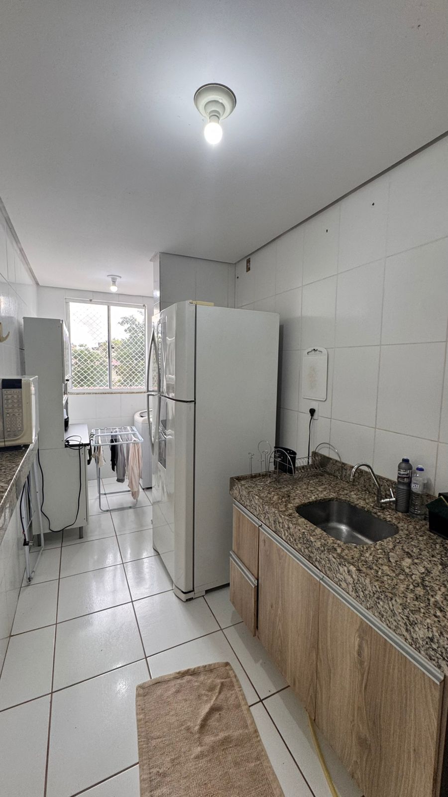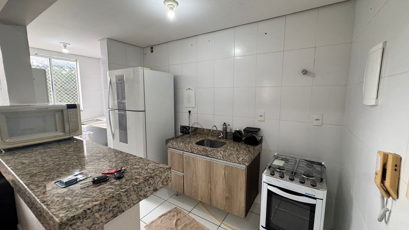 Cozinha completa com micro-ondas, geladeira, fogão, pia e armários.