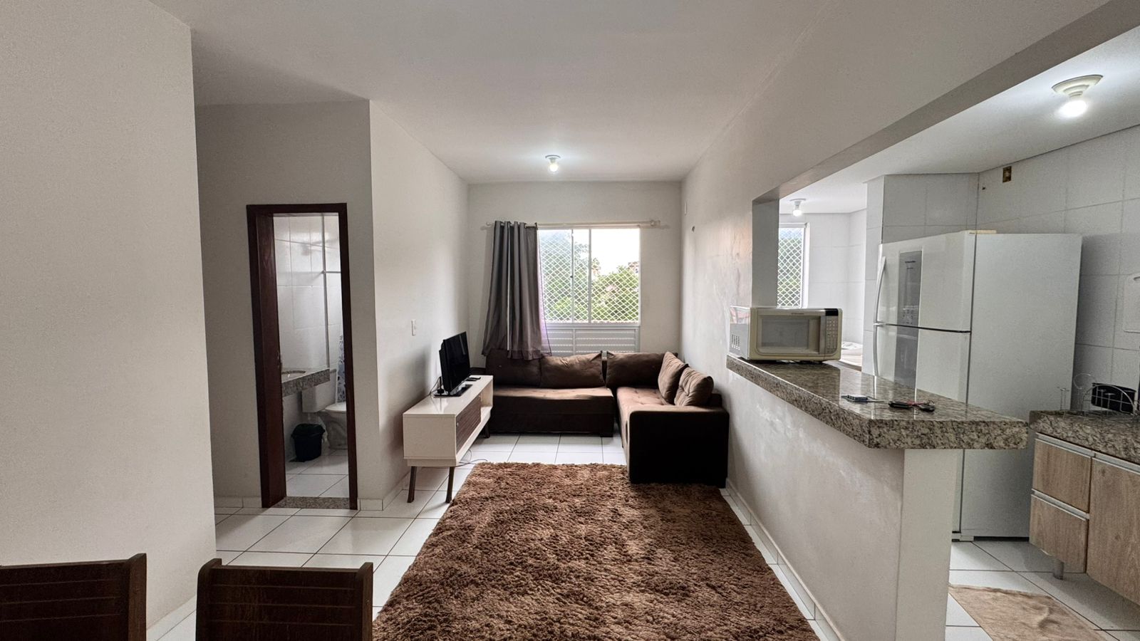 Apartamento totalmente mobiliado, com sala aconchegante equipada com sofá, TV, rack e tapete.