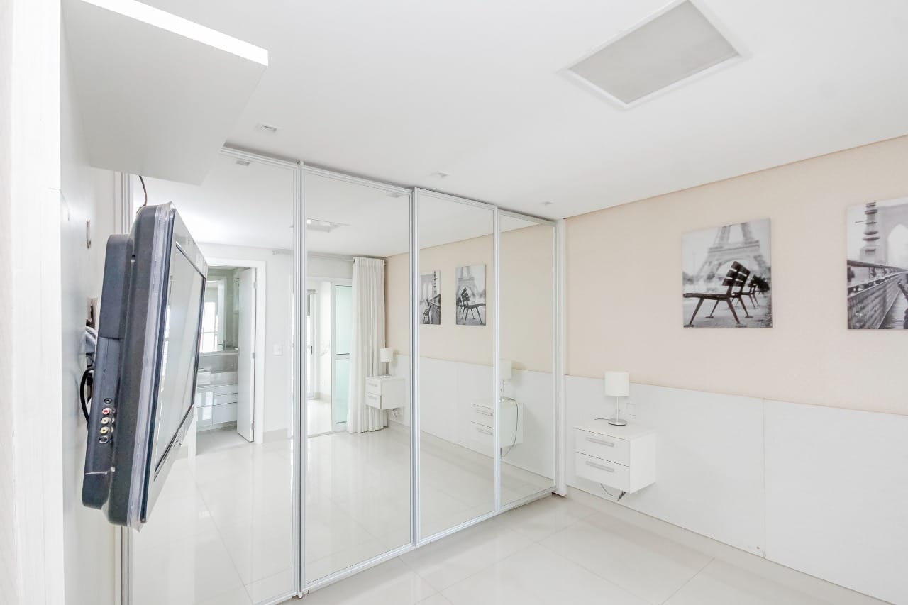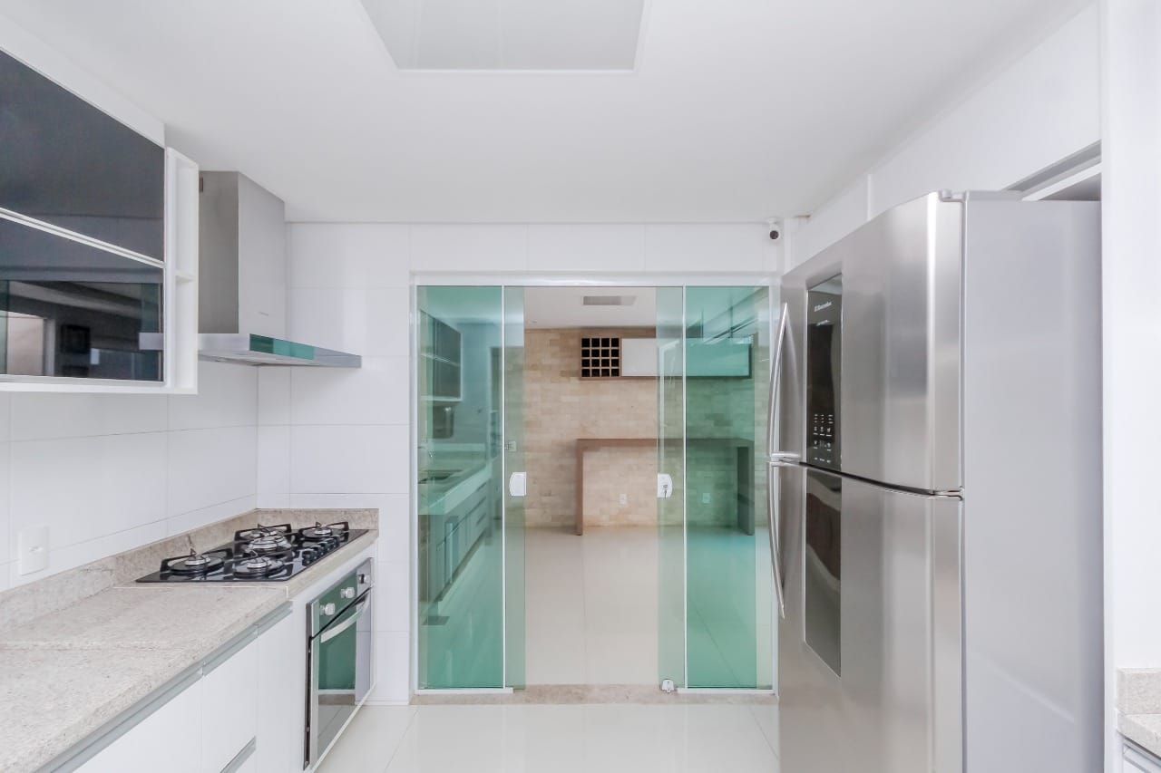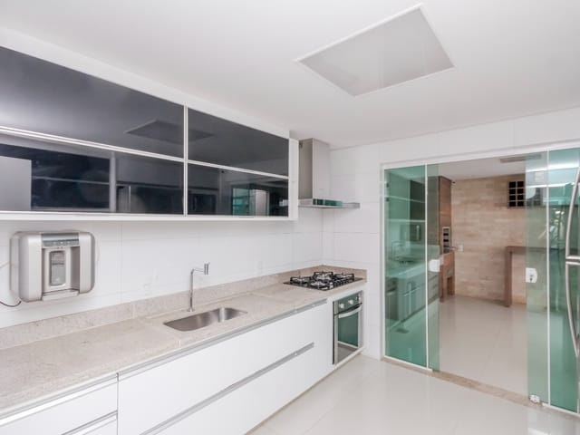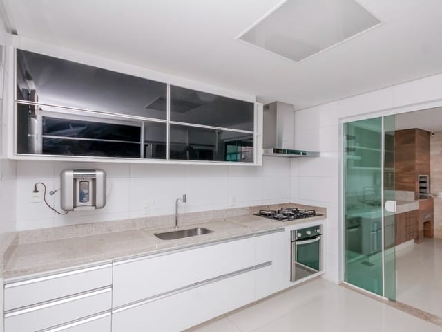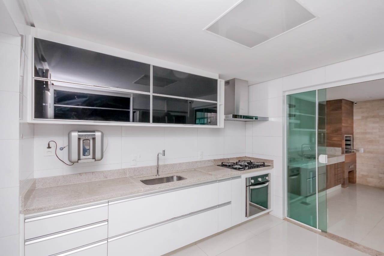 Imóvel possui sala de entrada com lavabo, acesso para o andar inferior por escada em granito direto para a sala de TV, onde se encontra 4 suítes plenas, sendo uma delas com escritório e outra com varanda. Todos os quartos e banheiros com armários de excelente qualidade, cozinha completa em armários, geladeira, cooktop e forno.