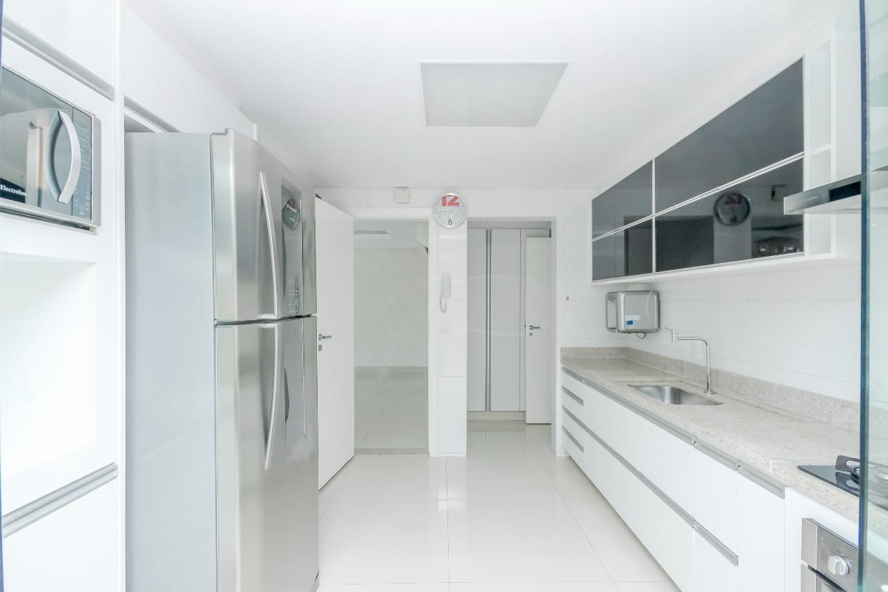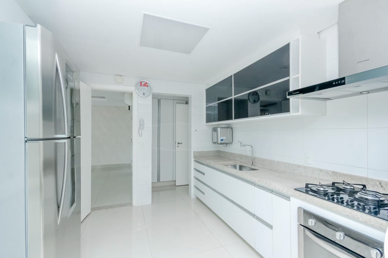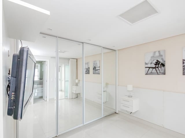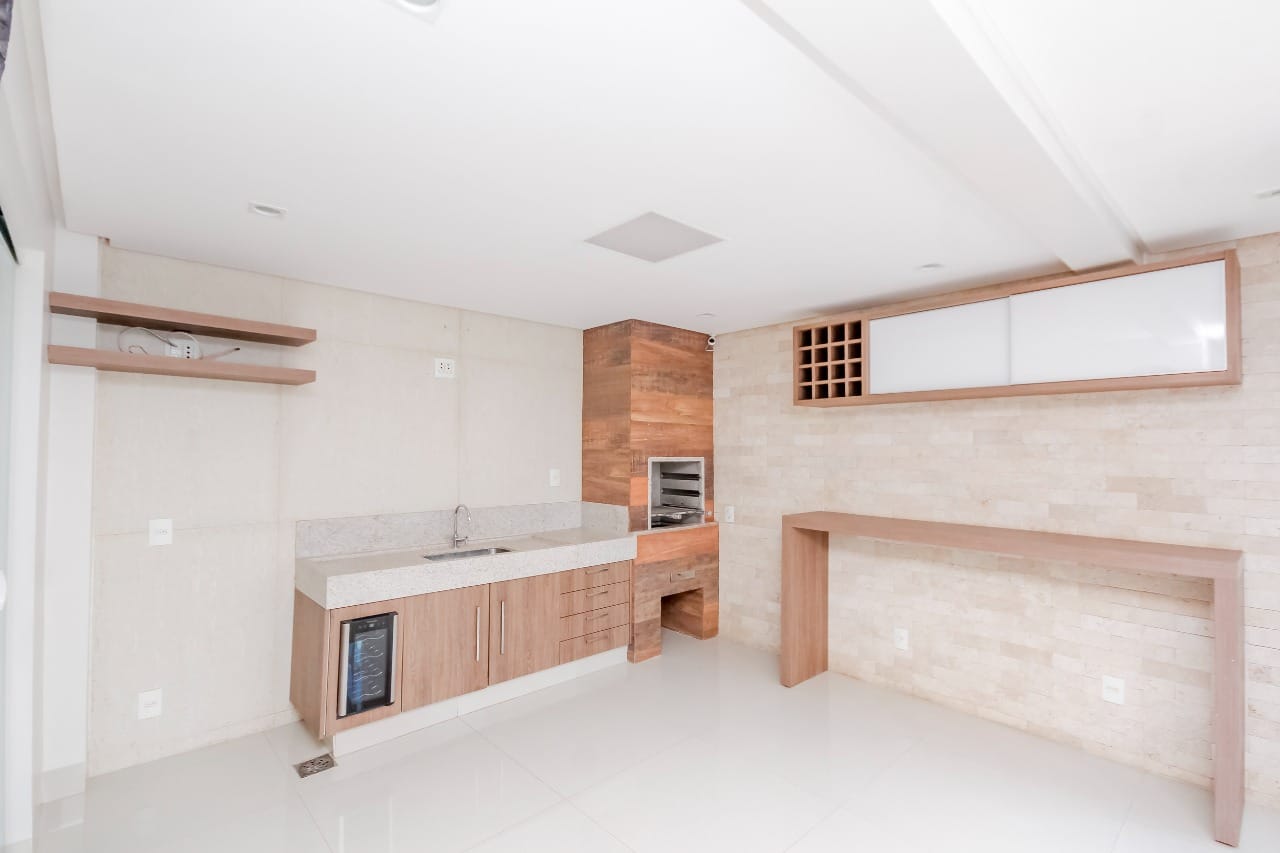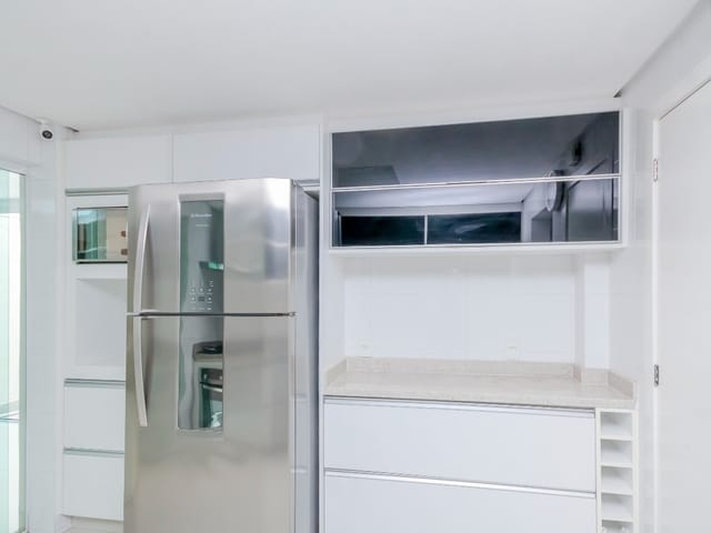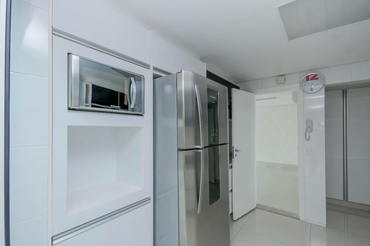 Imóvel possui sala de entrada com lavabo, acesso para o andar inferior por escada em granito direto para a sala de TV, onde se encontra 4 suítes plenas, sendo uma delas com escritório e outra com varanda. Todos os quartos e banheiros com armários de excelente qualidade, cozinha completa em armários, geladeira, cooktop e forno.