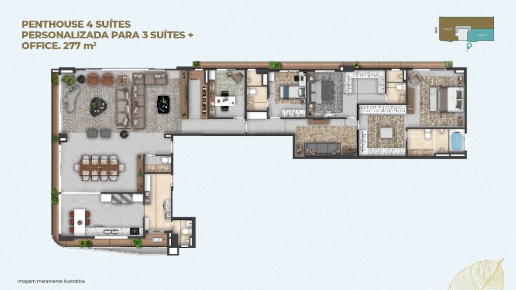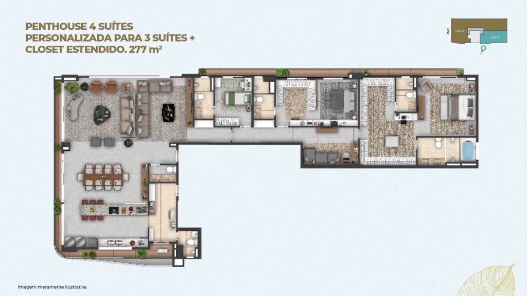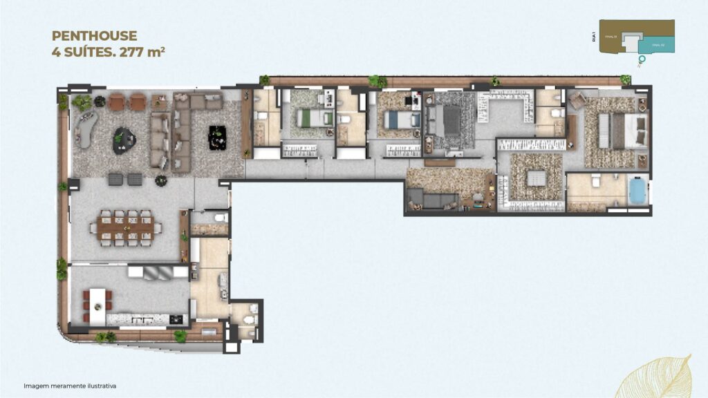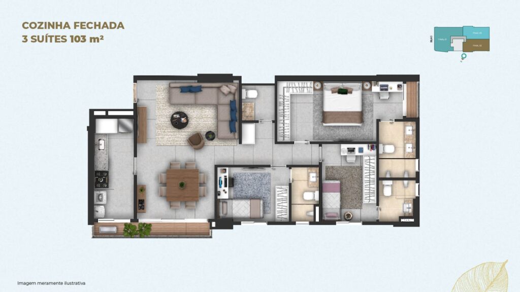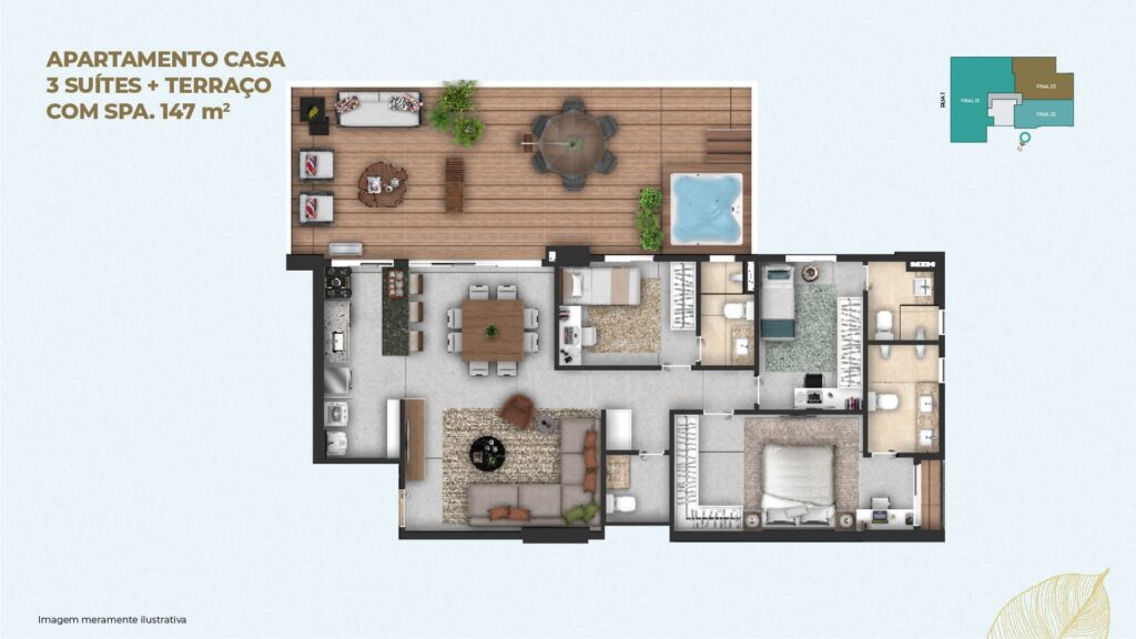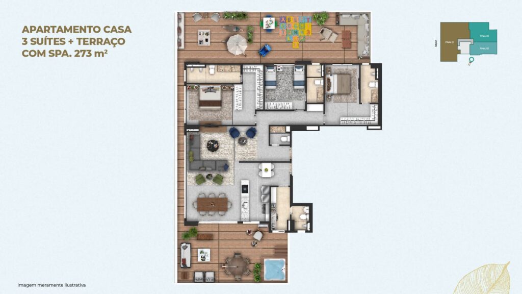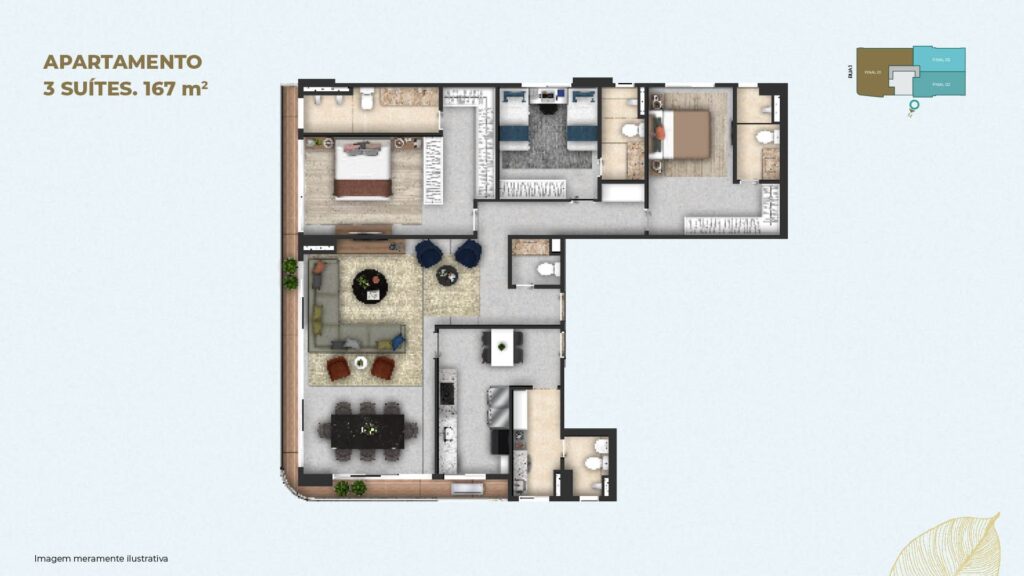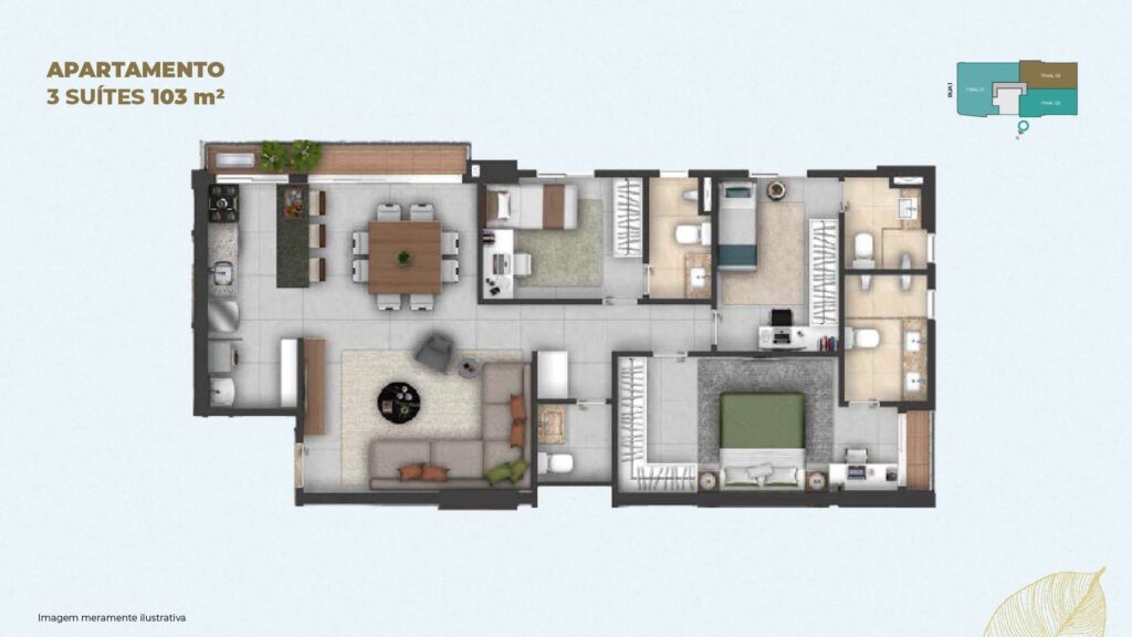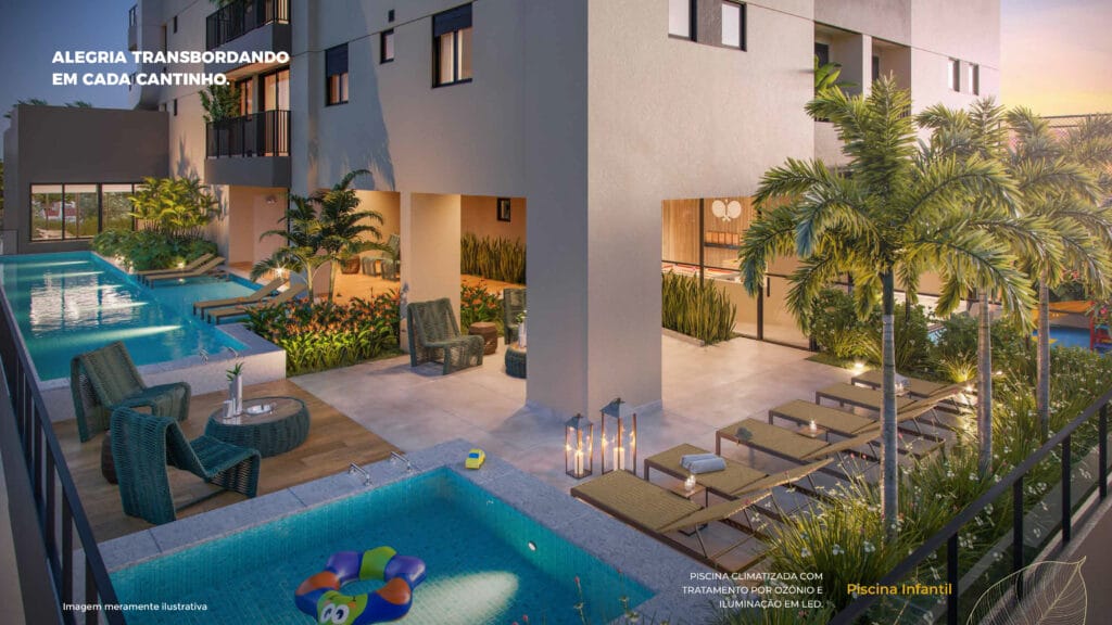 Apartamentos com 03 suítes, de 102 a 274 m², opções de lazer com piscinas adulto e infantil, salão de festas, academia, bicicletário e o ar puro que emana da natureza.