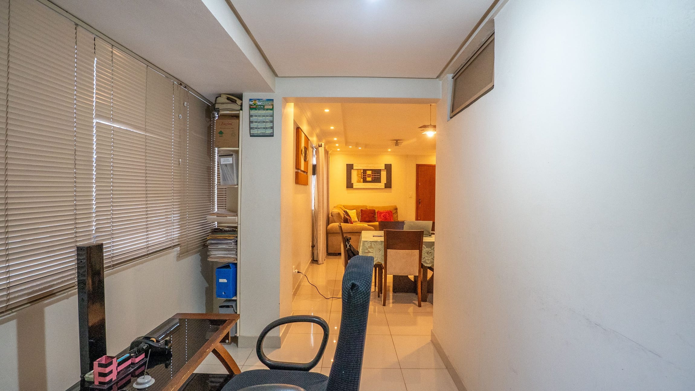 Varanda com cortina de vidor e integração para escritório