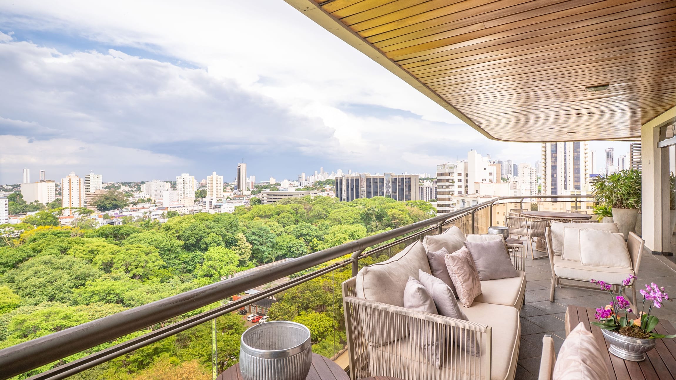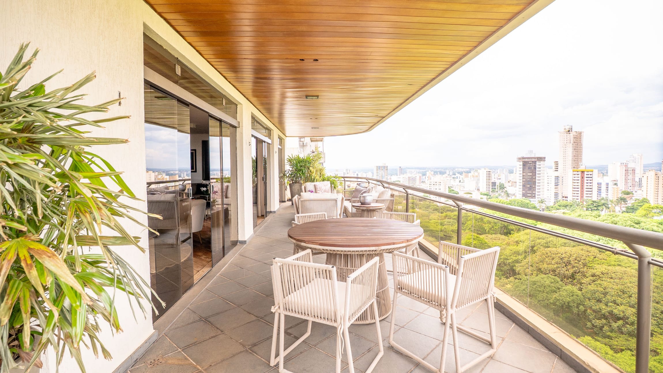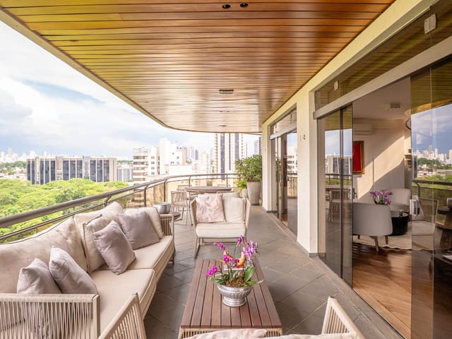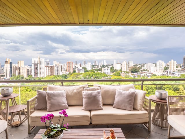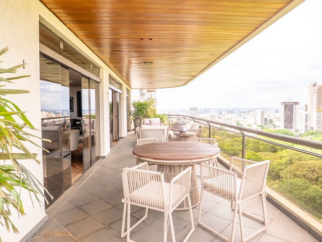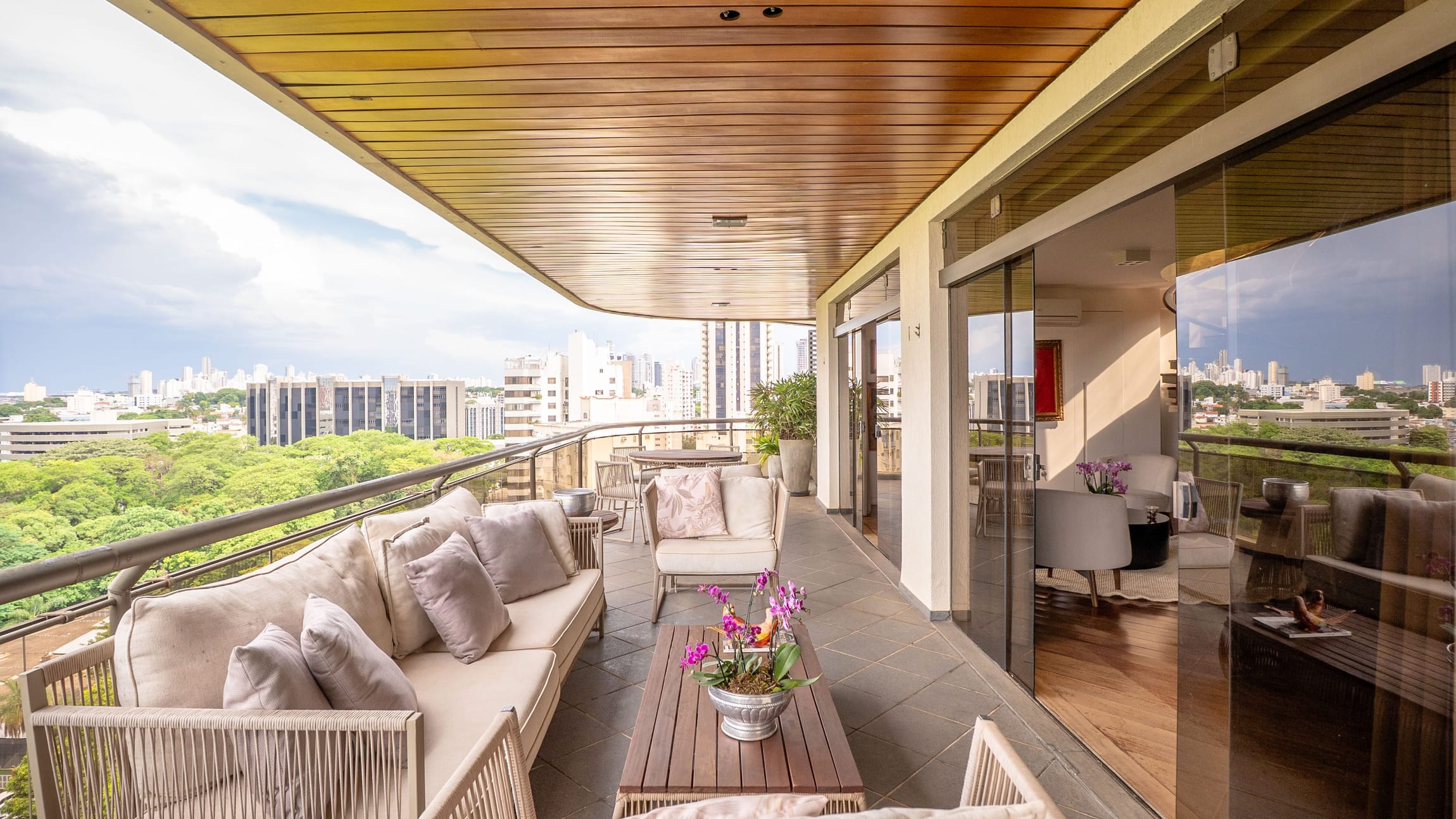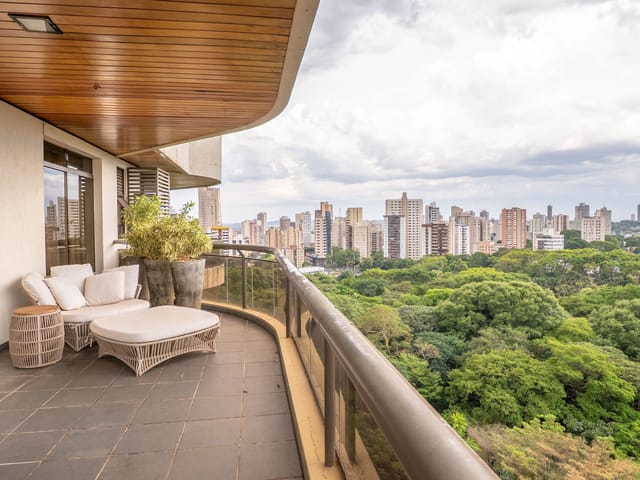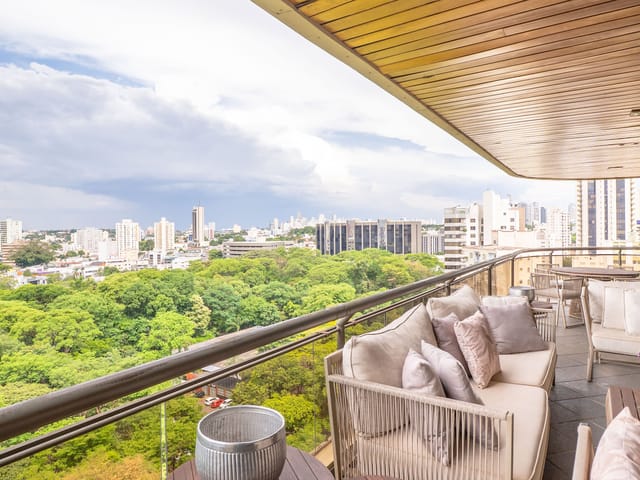 A varanda se estende por mais de 20 metros lineares, abraçando a cidade com uma vista definitiva para o Bosque dos Buritis — um espetáculo diário de verde e luz. O piso em madeira de pau-brasil se conecta harmoniosamente com o forro amadeirado e os móveis de linhas orgânicas, criando uma atmosfera acolhedora e elegante.