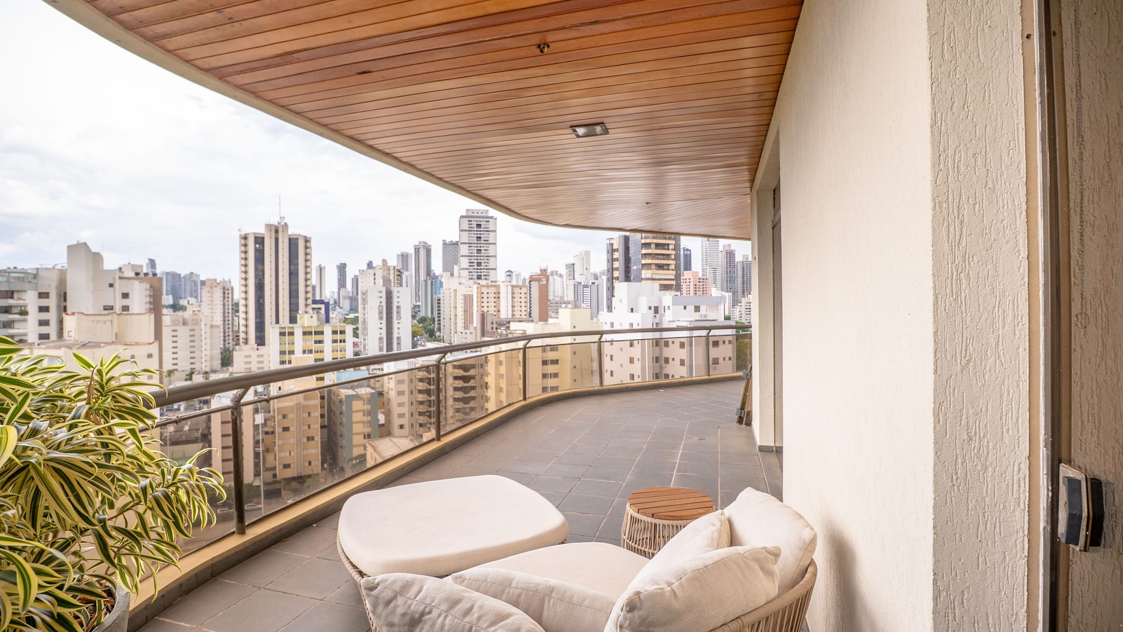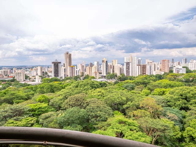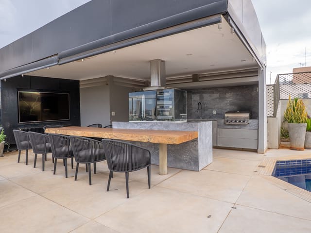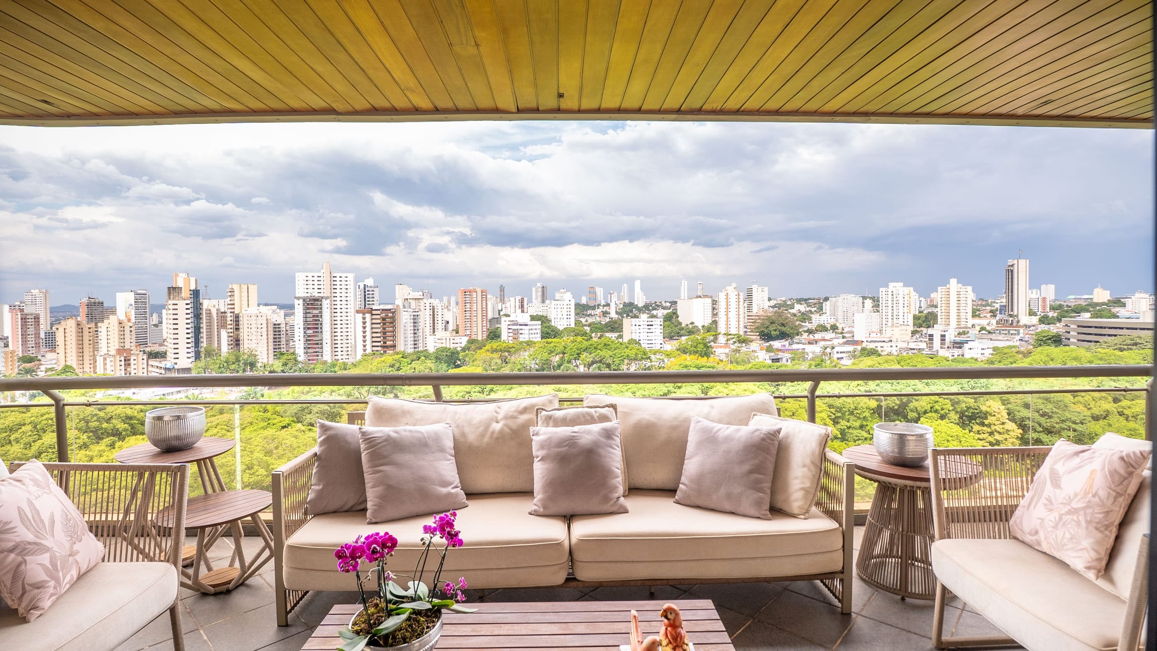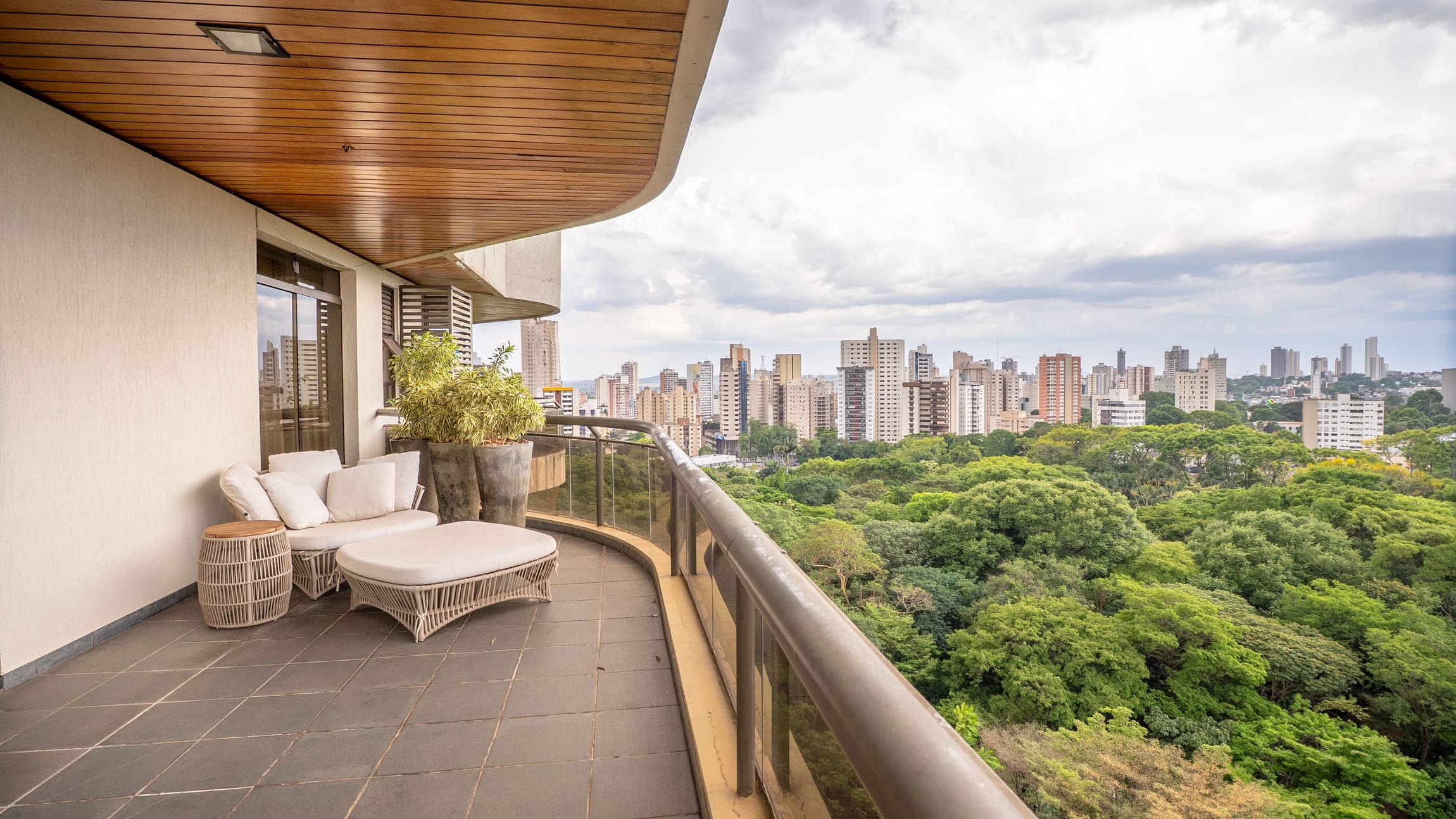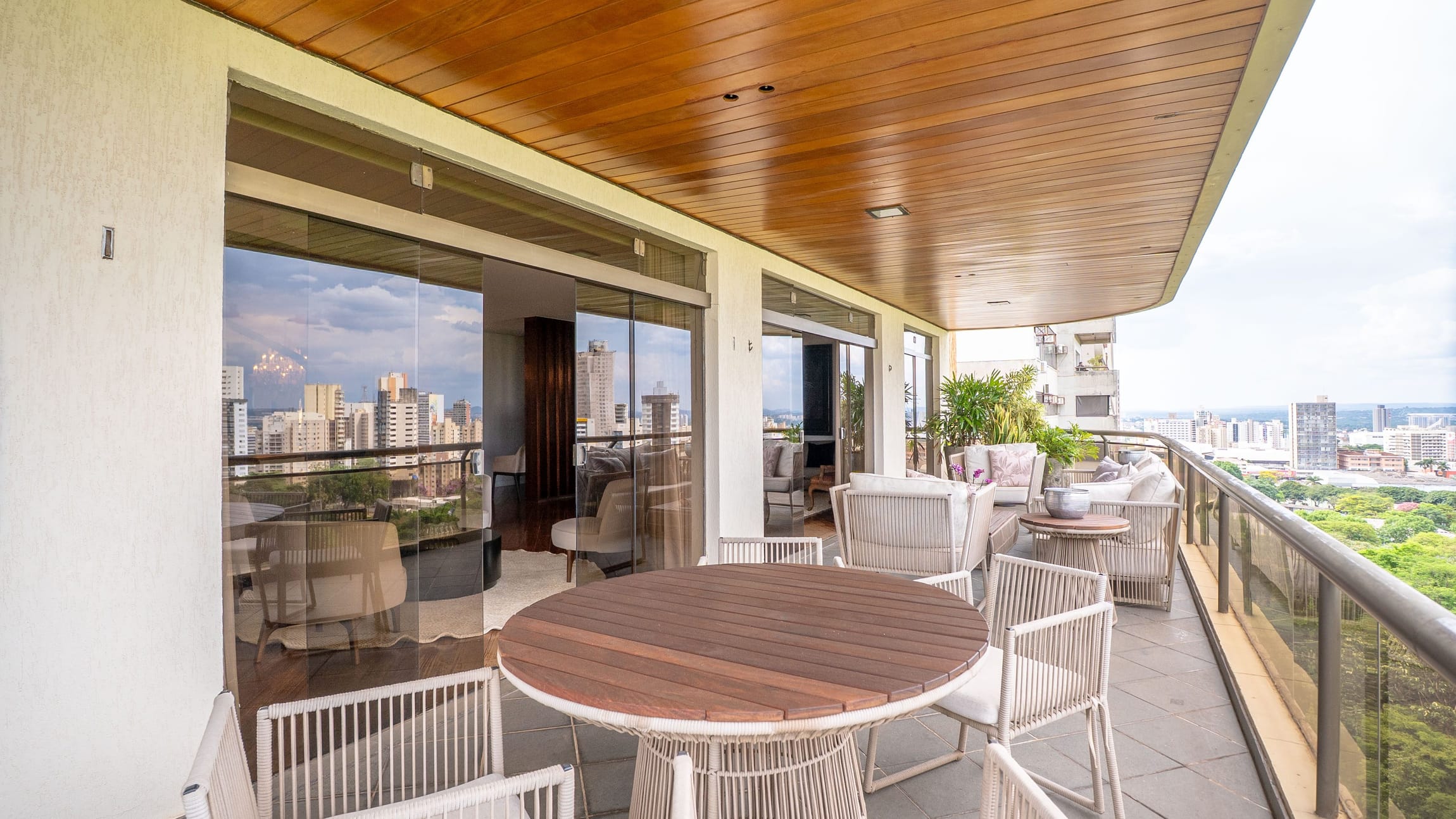 A varanda se estende por mais de 20 metros lineares, abraçando a cidade com uma vista definitiva para o Bosque dos Buritis — um espetáculo diário de verde e luz. O piso em madeira de pau-brasil se conecta harmoniosamente com o forro amadeirado e os móveis de linhas orgânicas, criando uma atmosfera acolhedora e elegante.