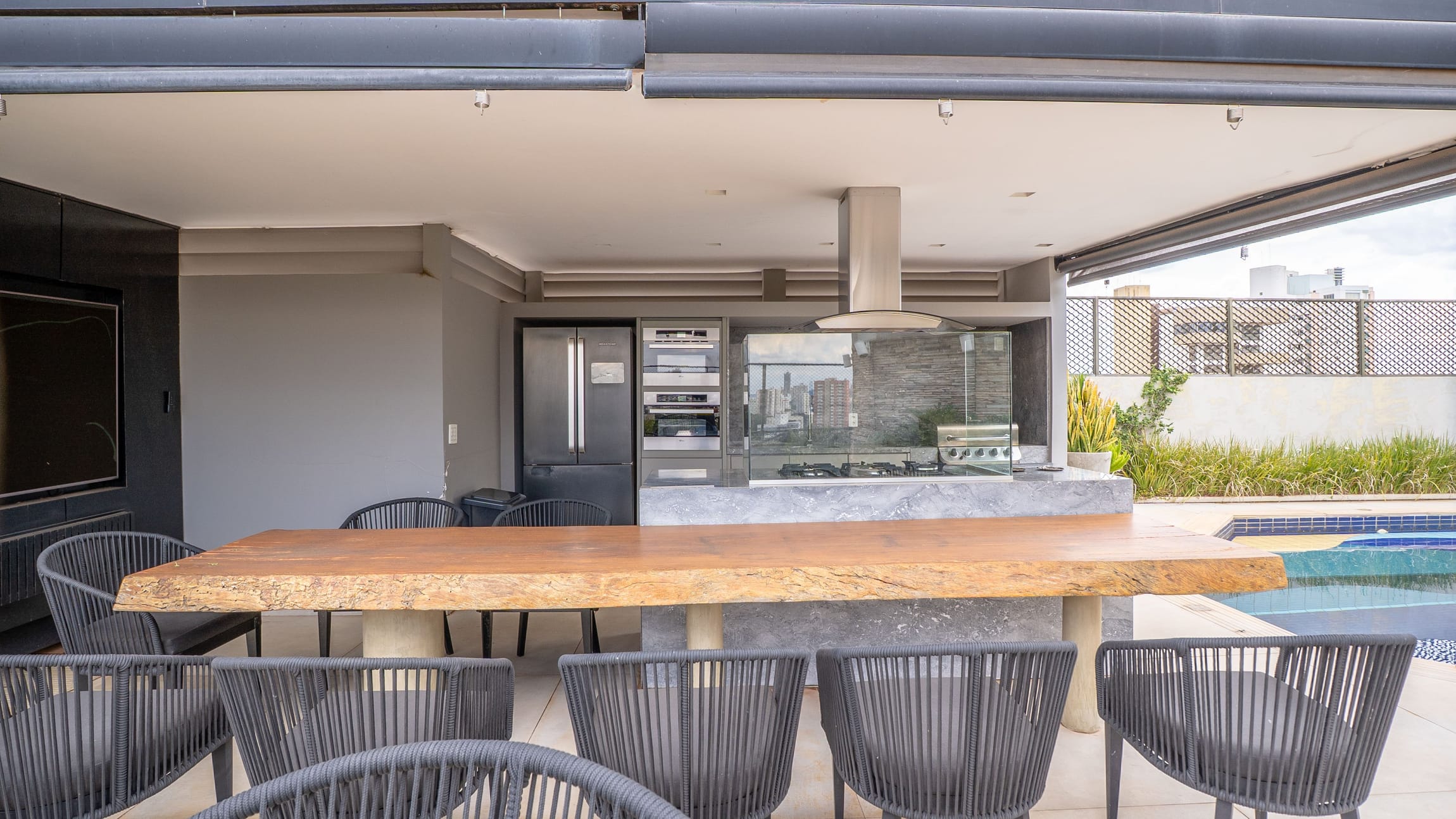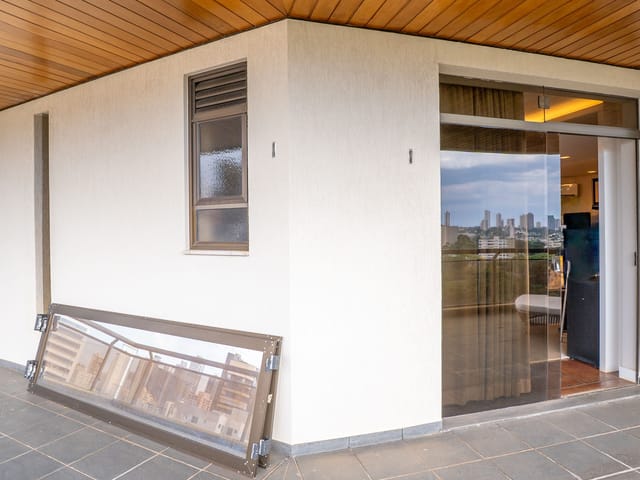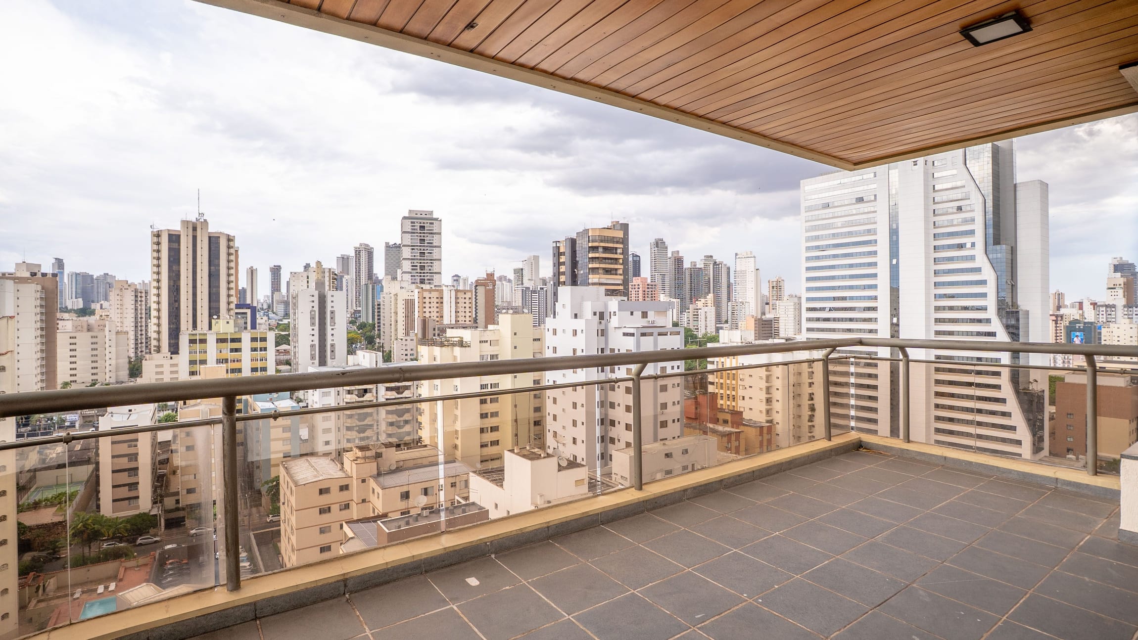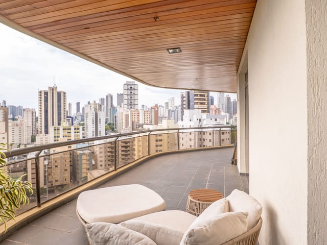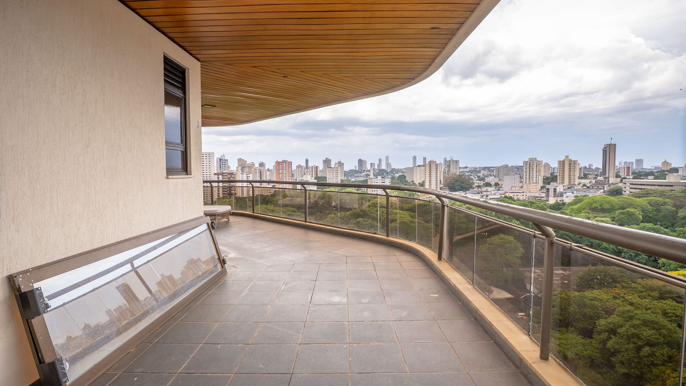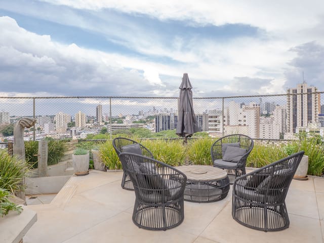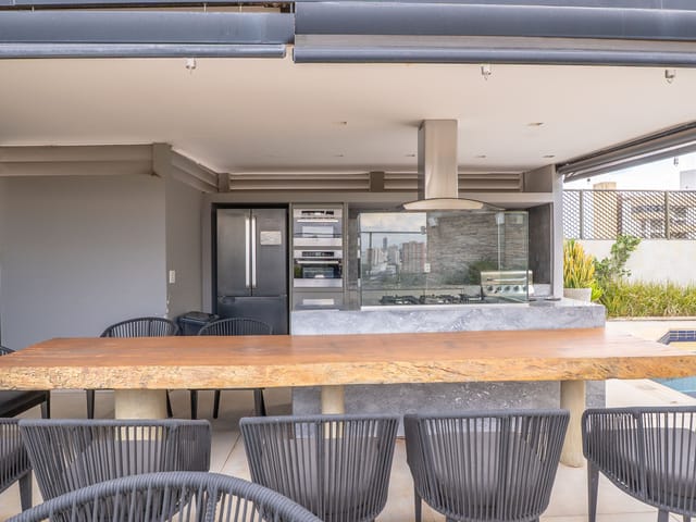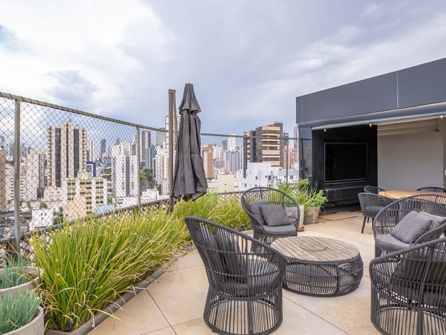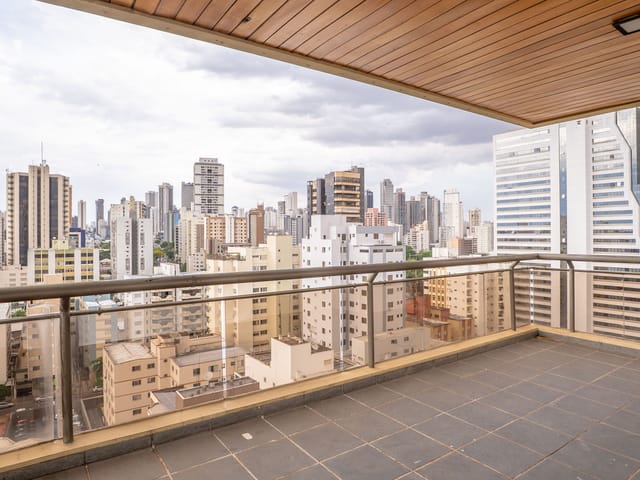 A varanda se estende por mais de 20 metros lineares, abraçando a cidade com uma vista definitiva para o Bosque dos Buritis — um espetáculo diário de verde e luz. O piso em madeira de pau-brasil se conecta harmoniosamente com o forro amadeirado e os móveis de linhas orgânicas, criando uma atmosfera acolhedora e elegante.