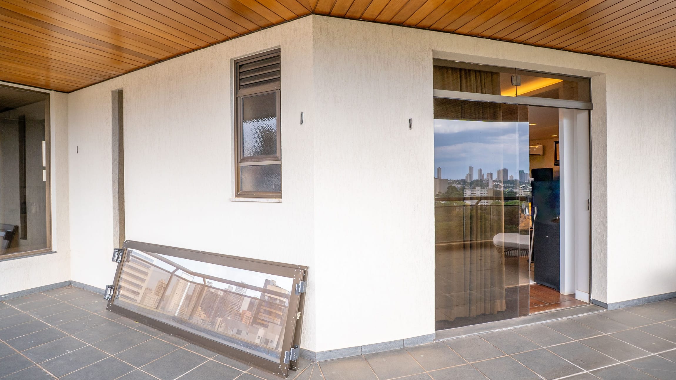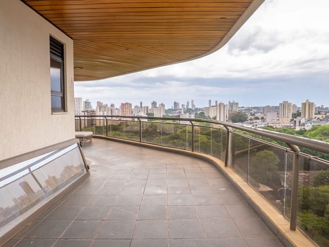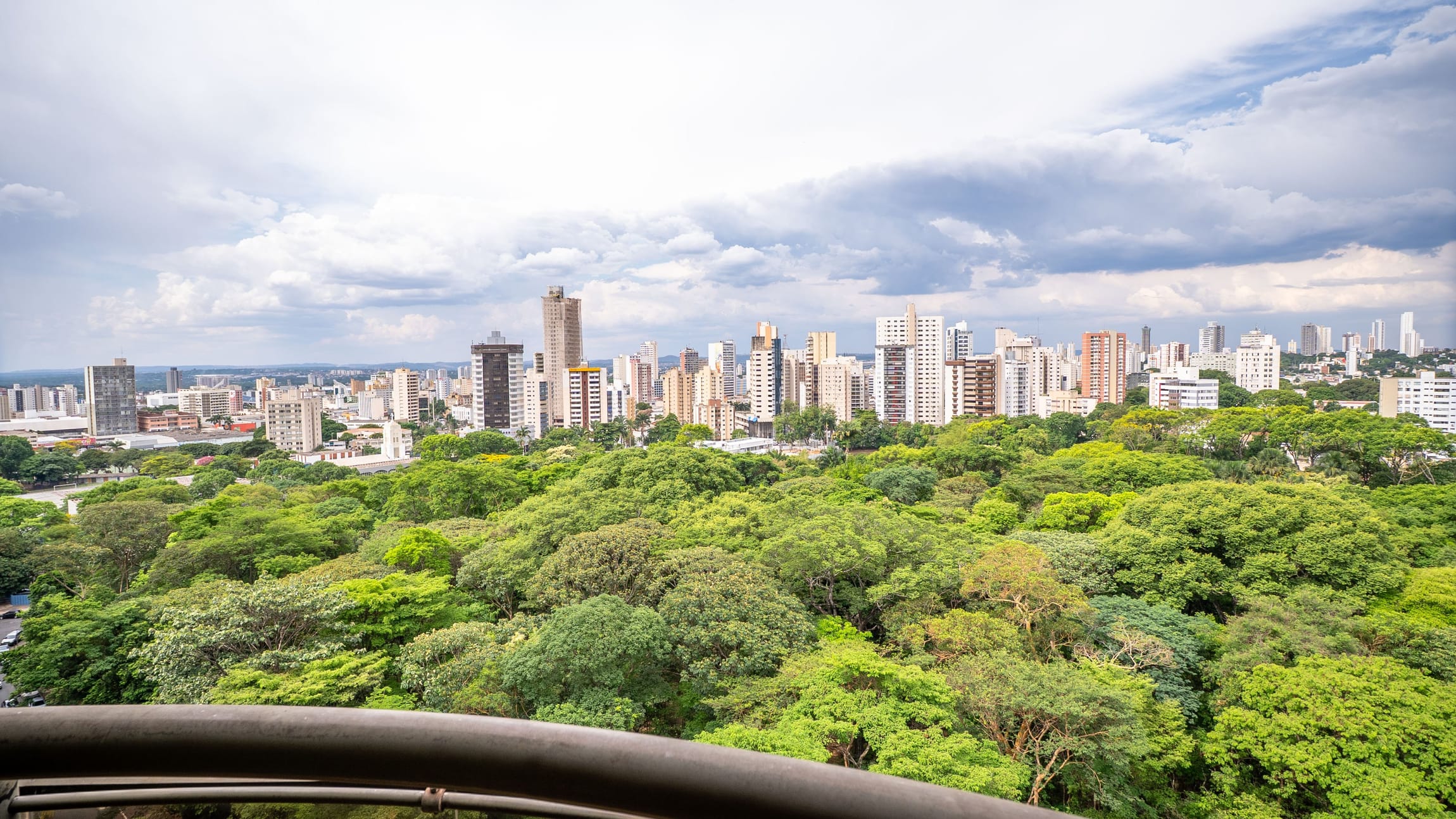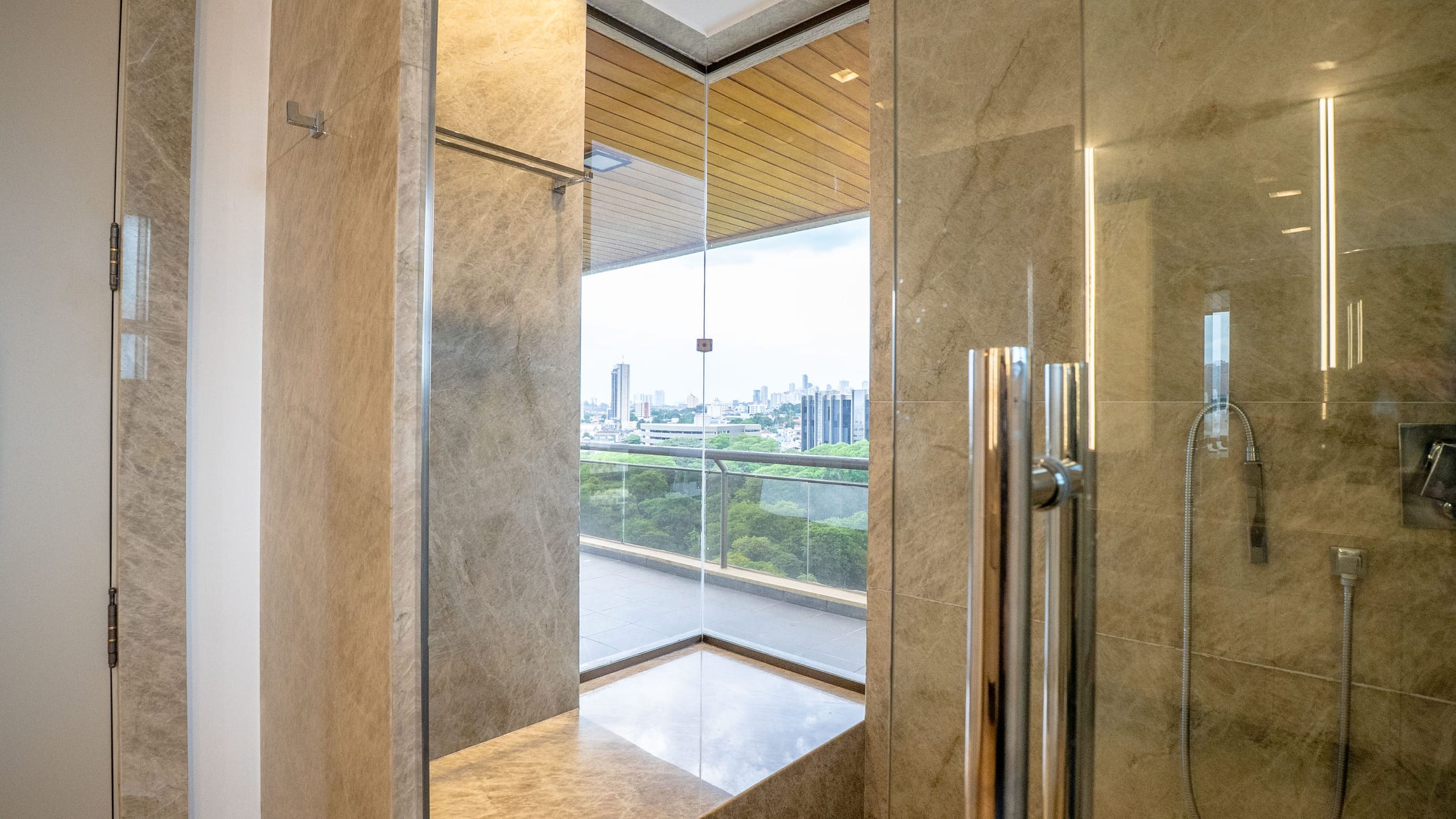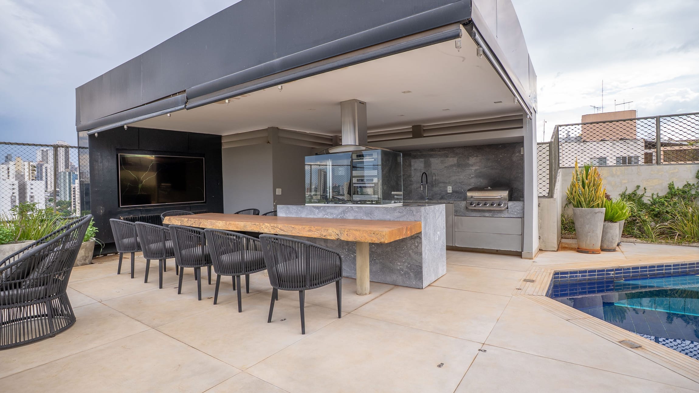 A varanda se estende por mais de 20 metros lineares, abraçando a cidade com uma vista definitiva para o Bosque dos Buritis — um espetáculo diário de verde e luz. O piso em madeira de pau-brasil se conecta harmoniosamente com o forro amadeirado e os móveis de linhas orgânicas, criando uma atmosfera acolhedora e elegante.