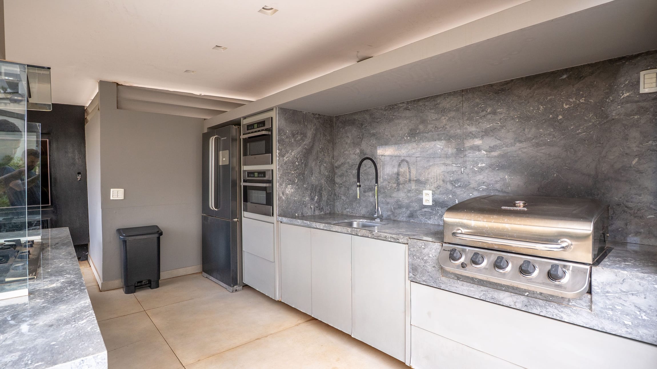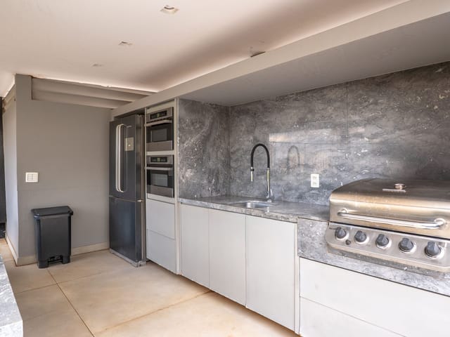 •	Espaço gourmet equipado com churrasqueira a gás e bancadas em mármore;