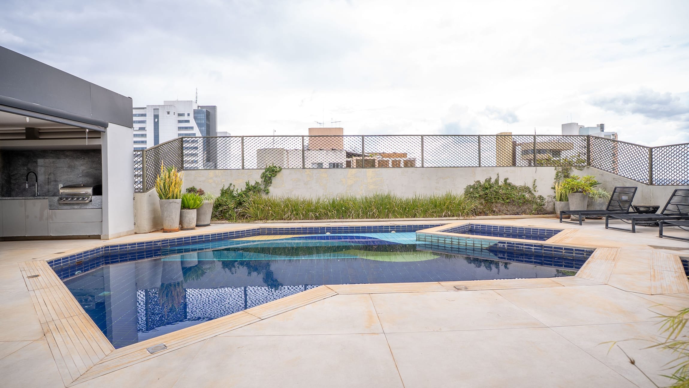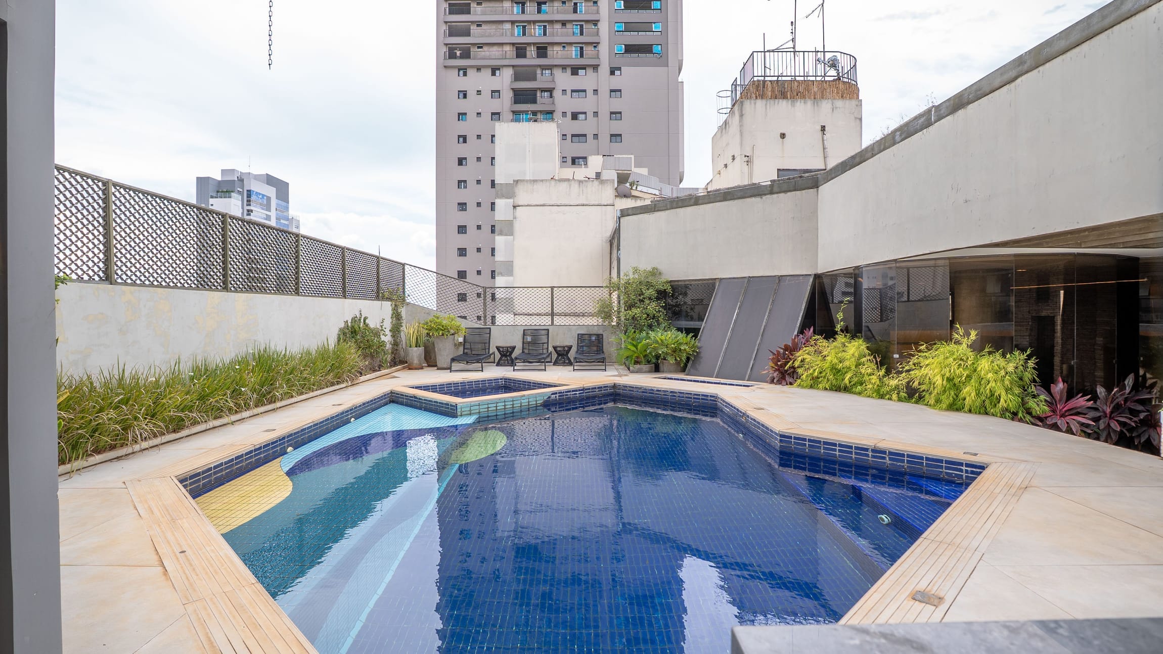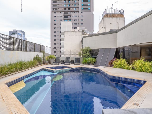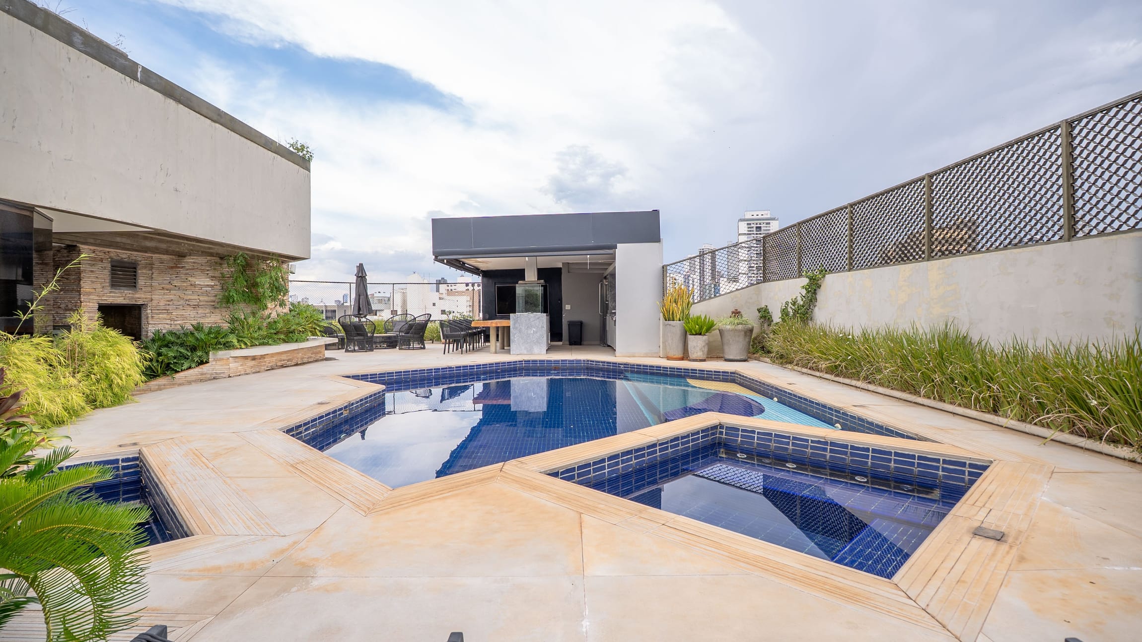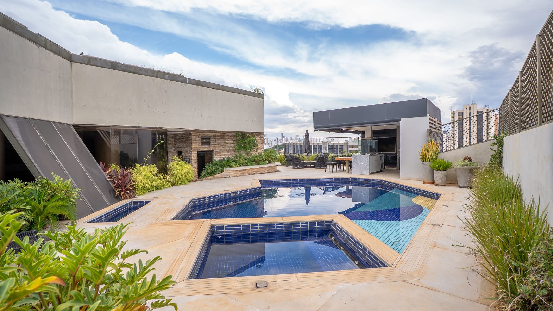 •	Piscina com deck e jardim elevado;
