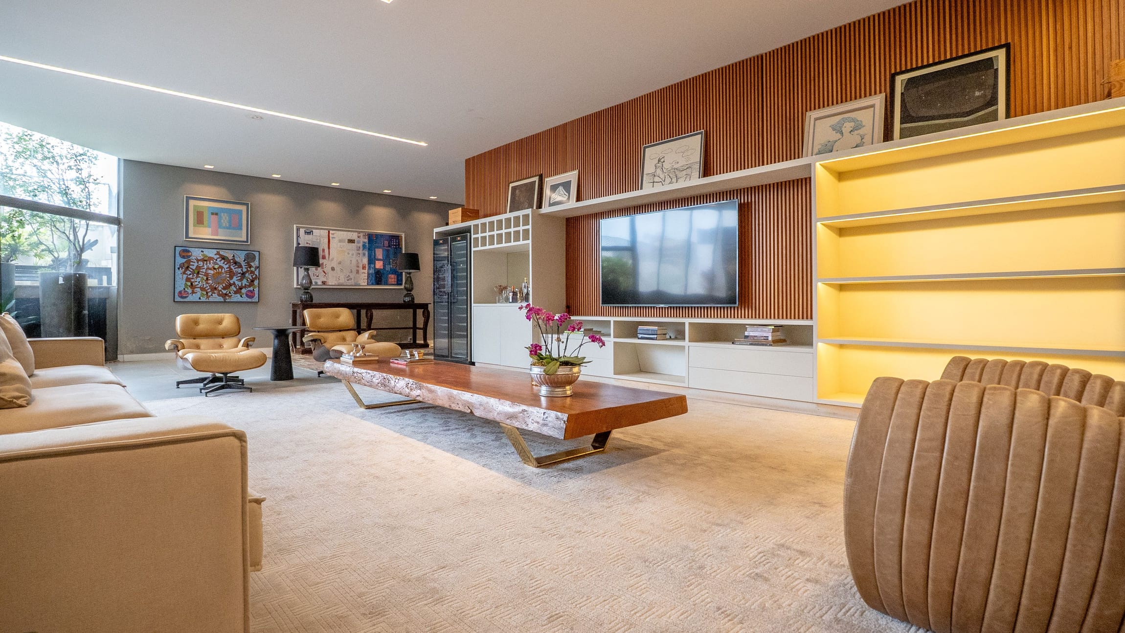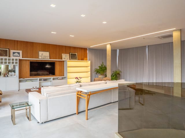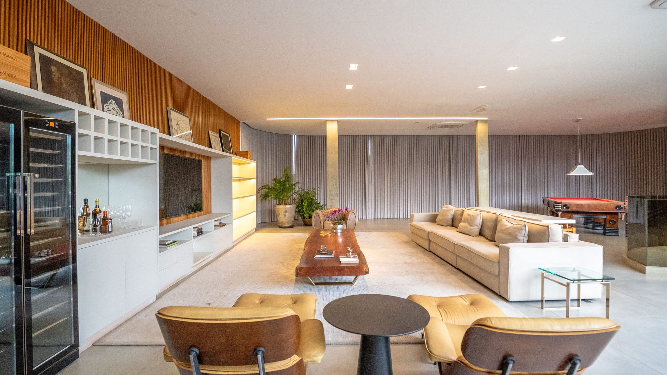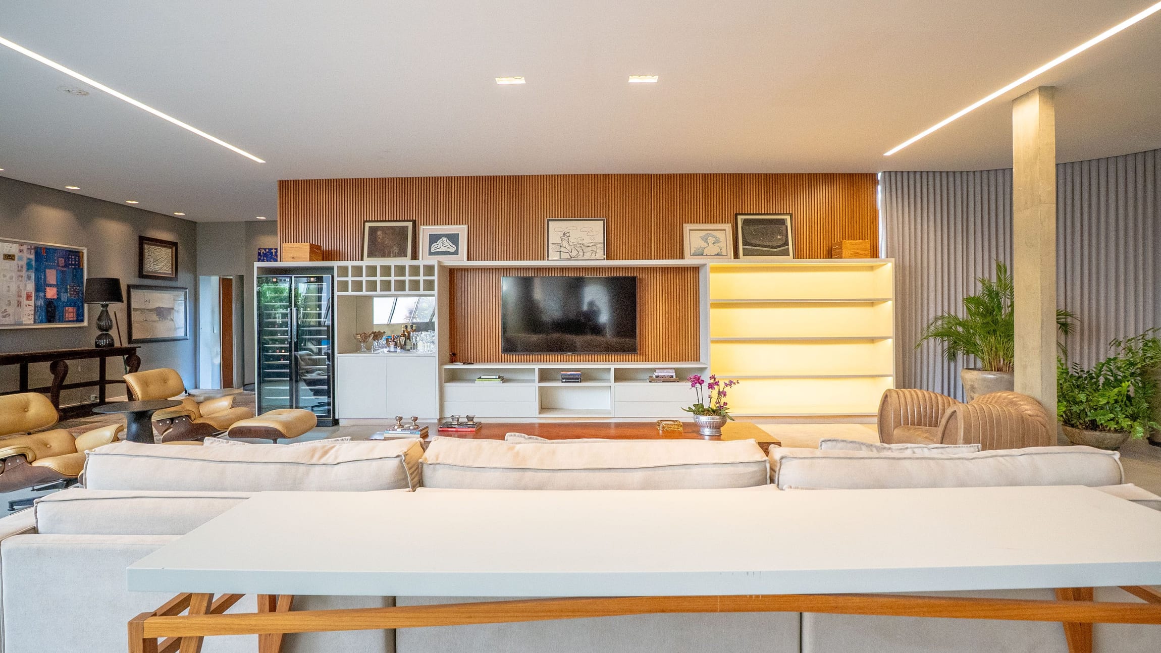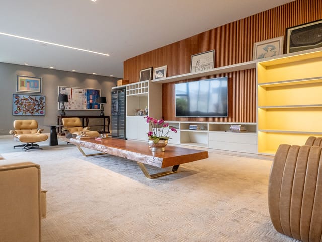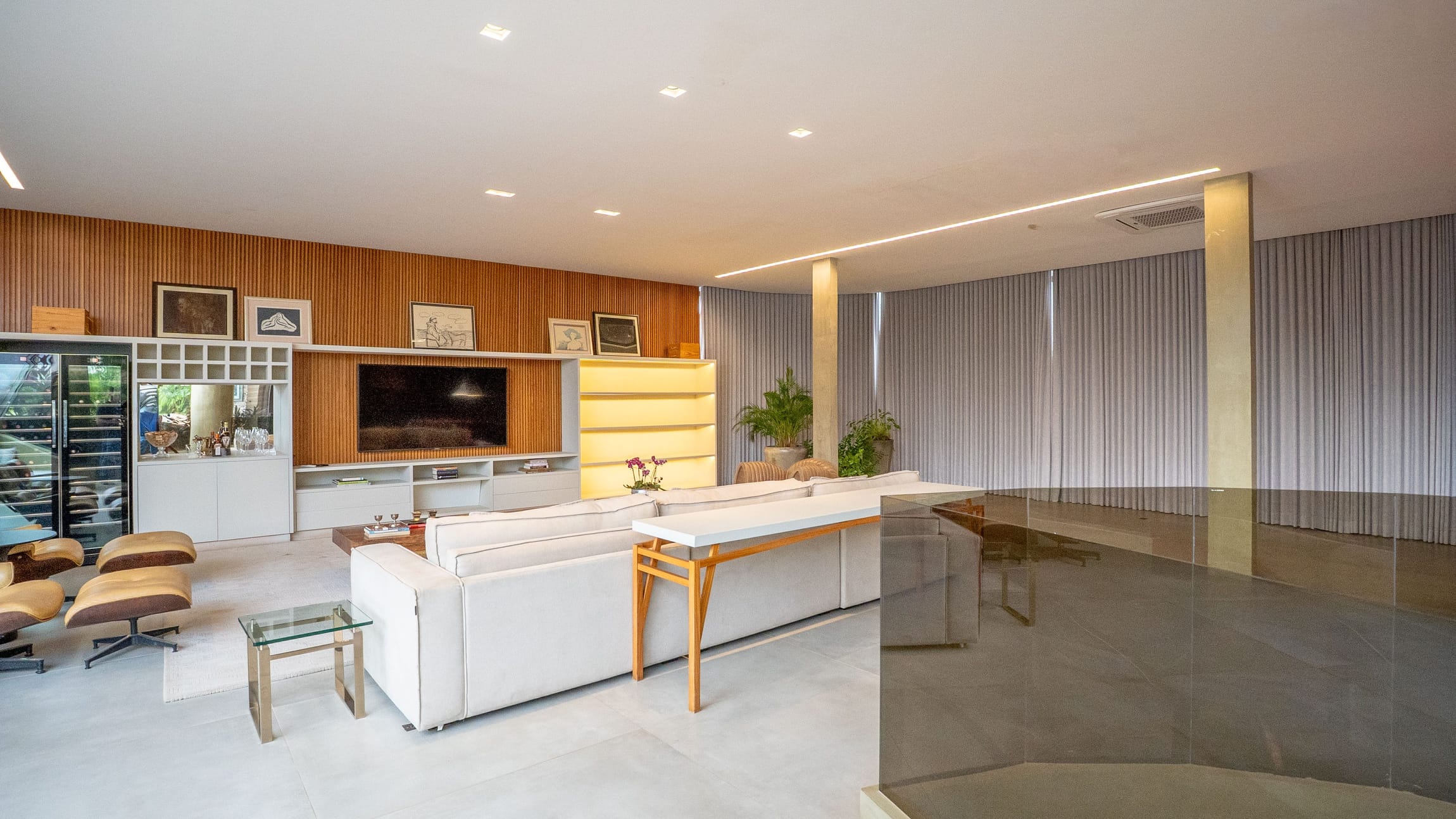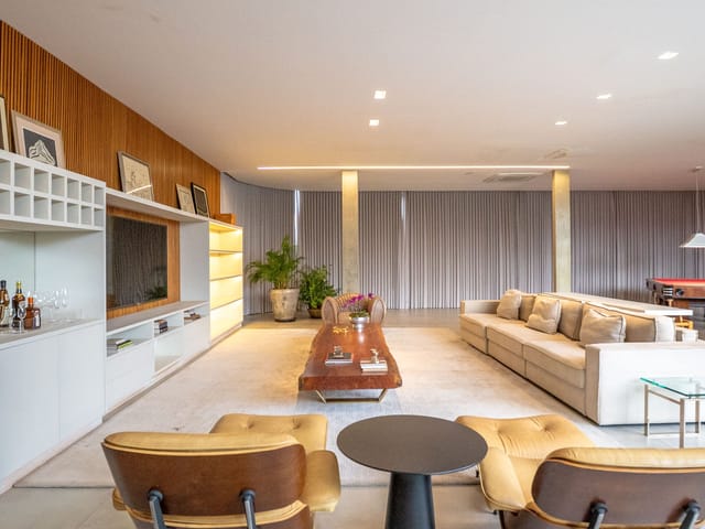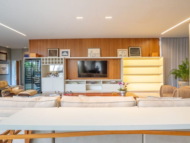 •	Sala para três ambientes com painéis ripados e adega climatizada;