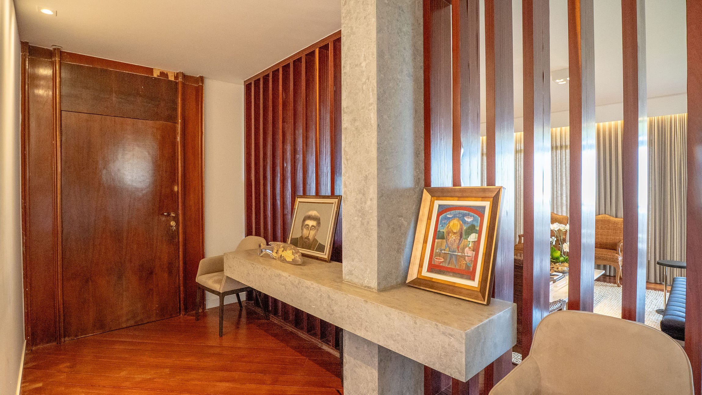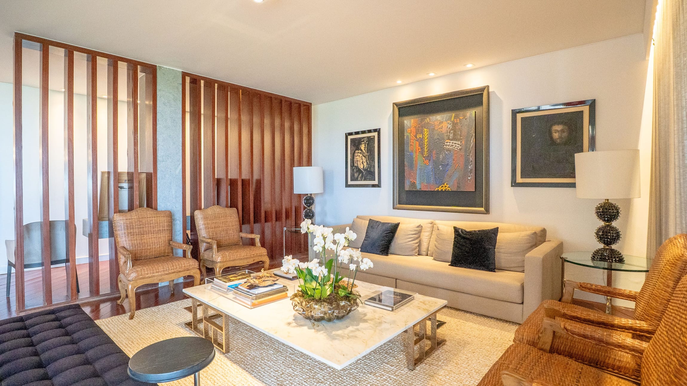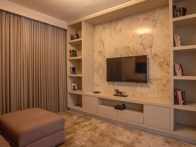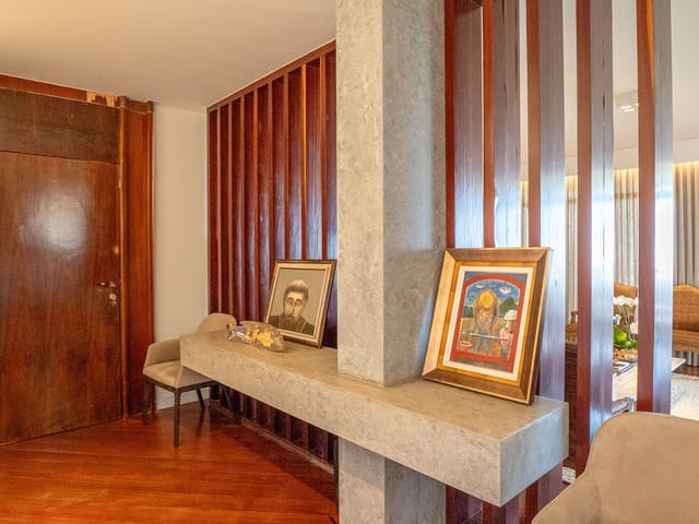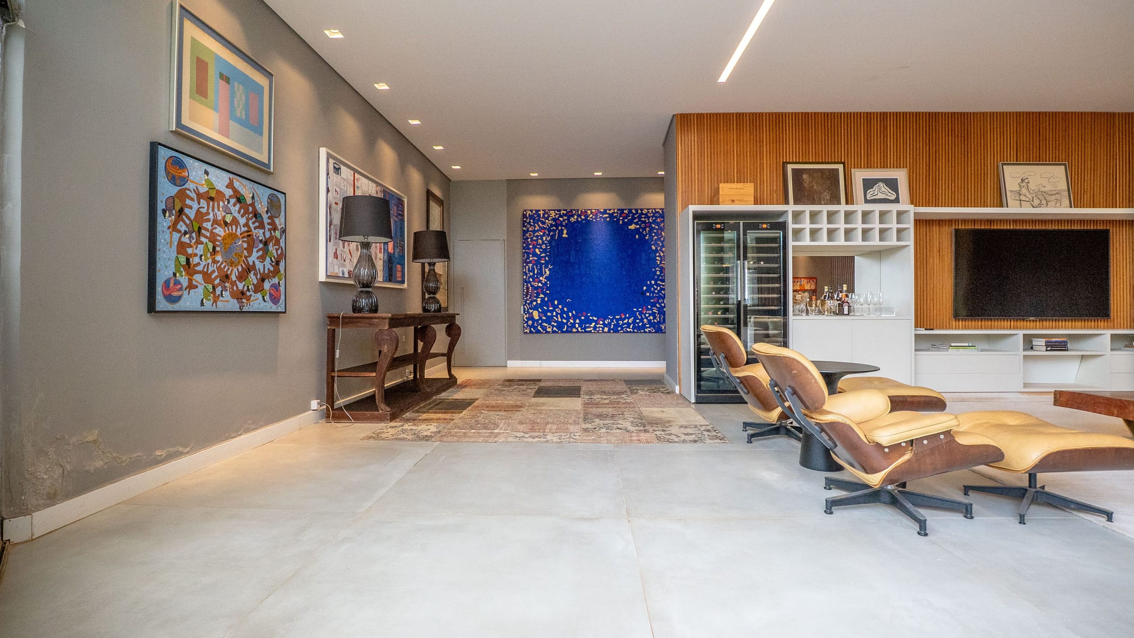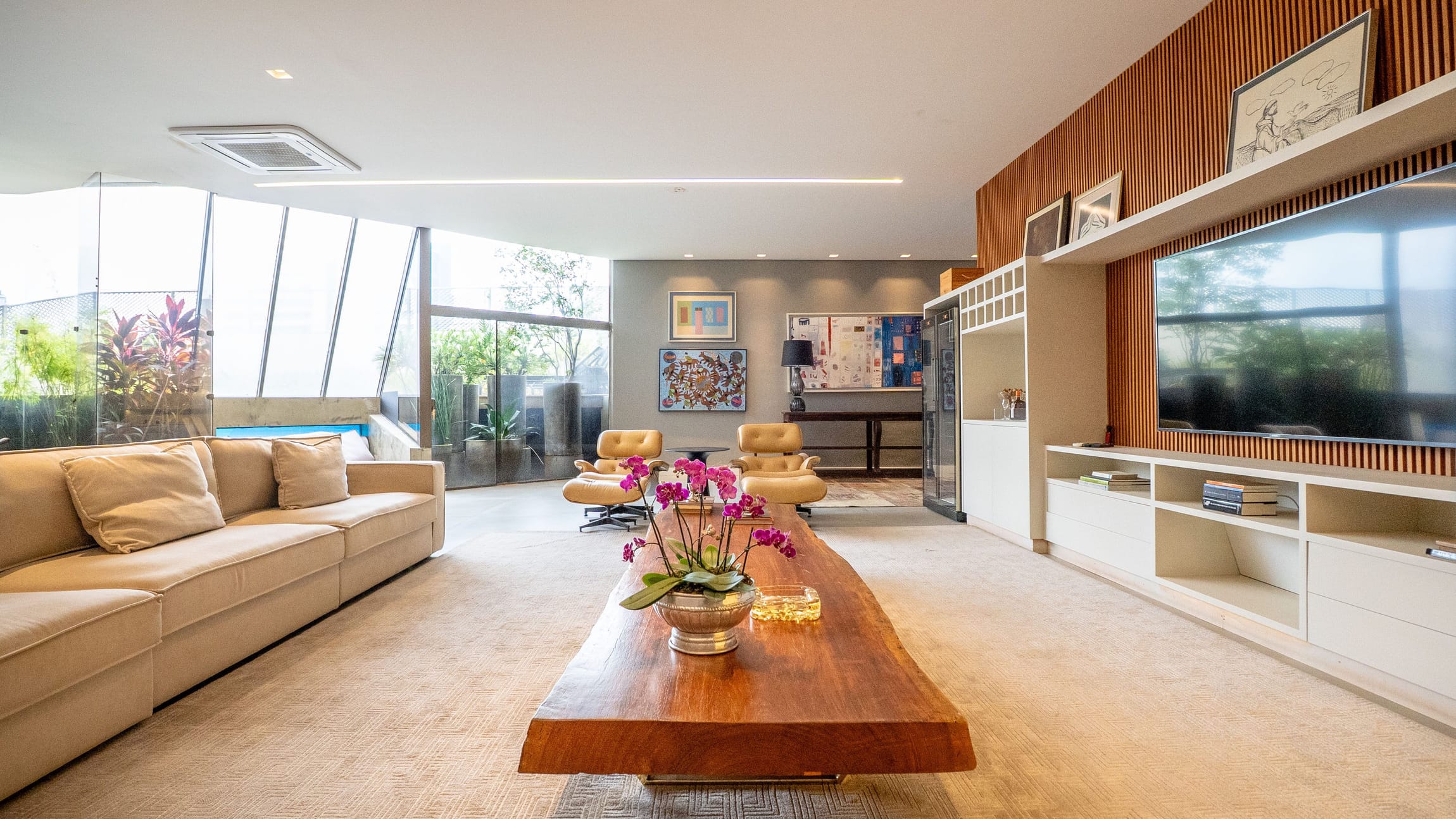 •	Sala para três ambientes com painéis ripados e adega climatizada;