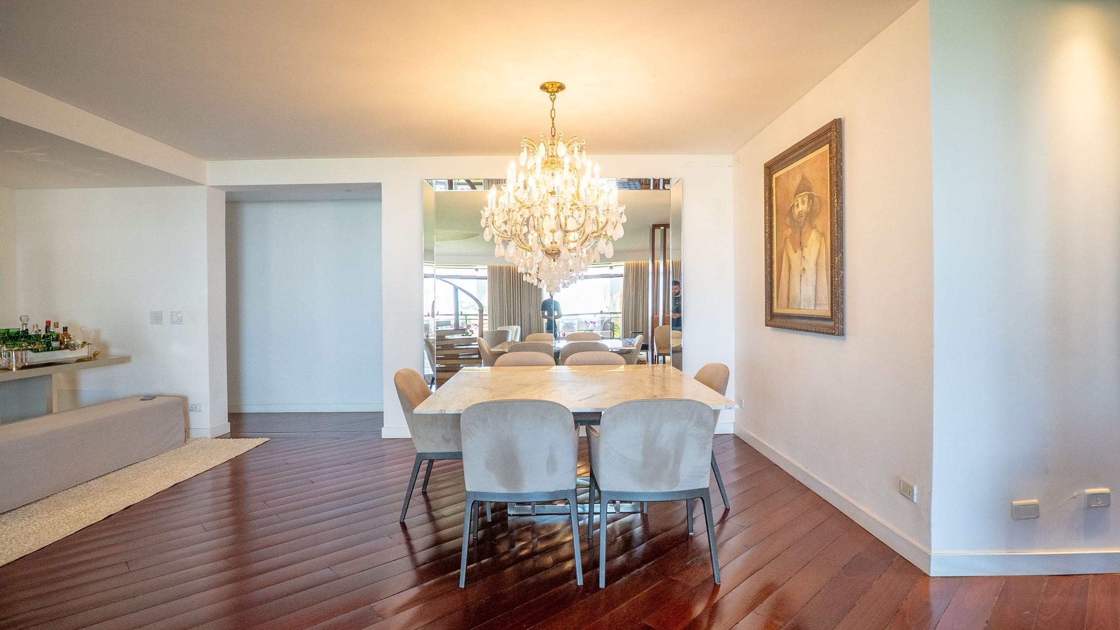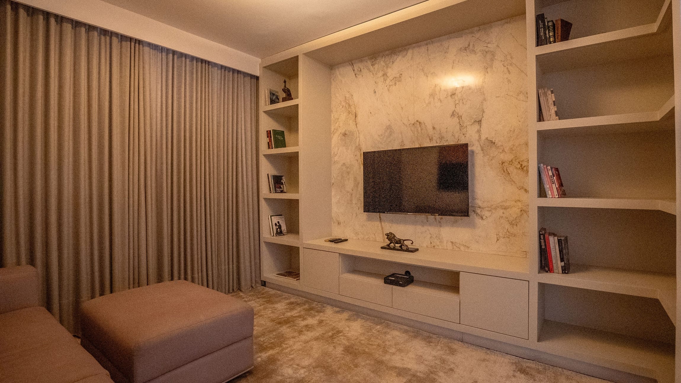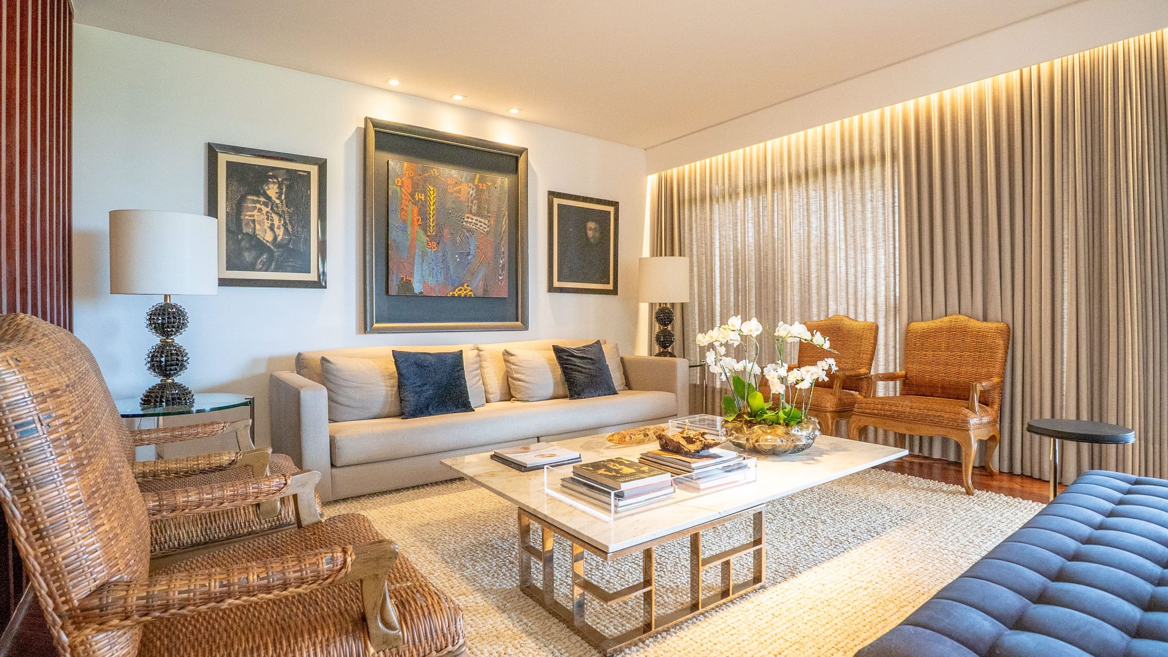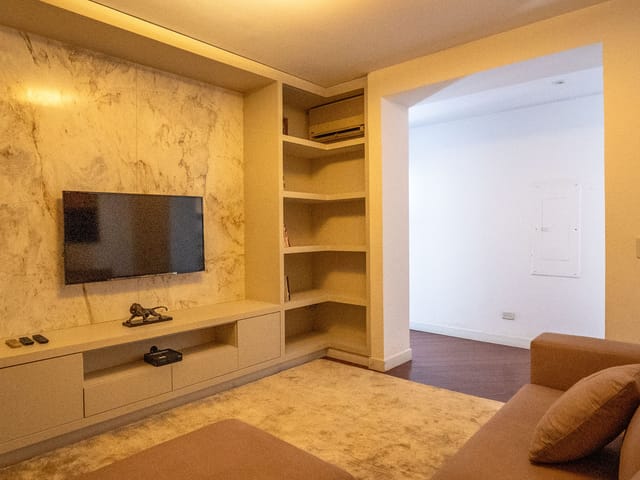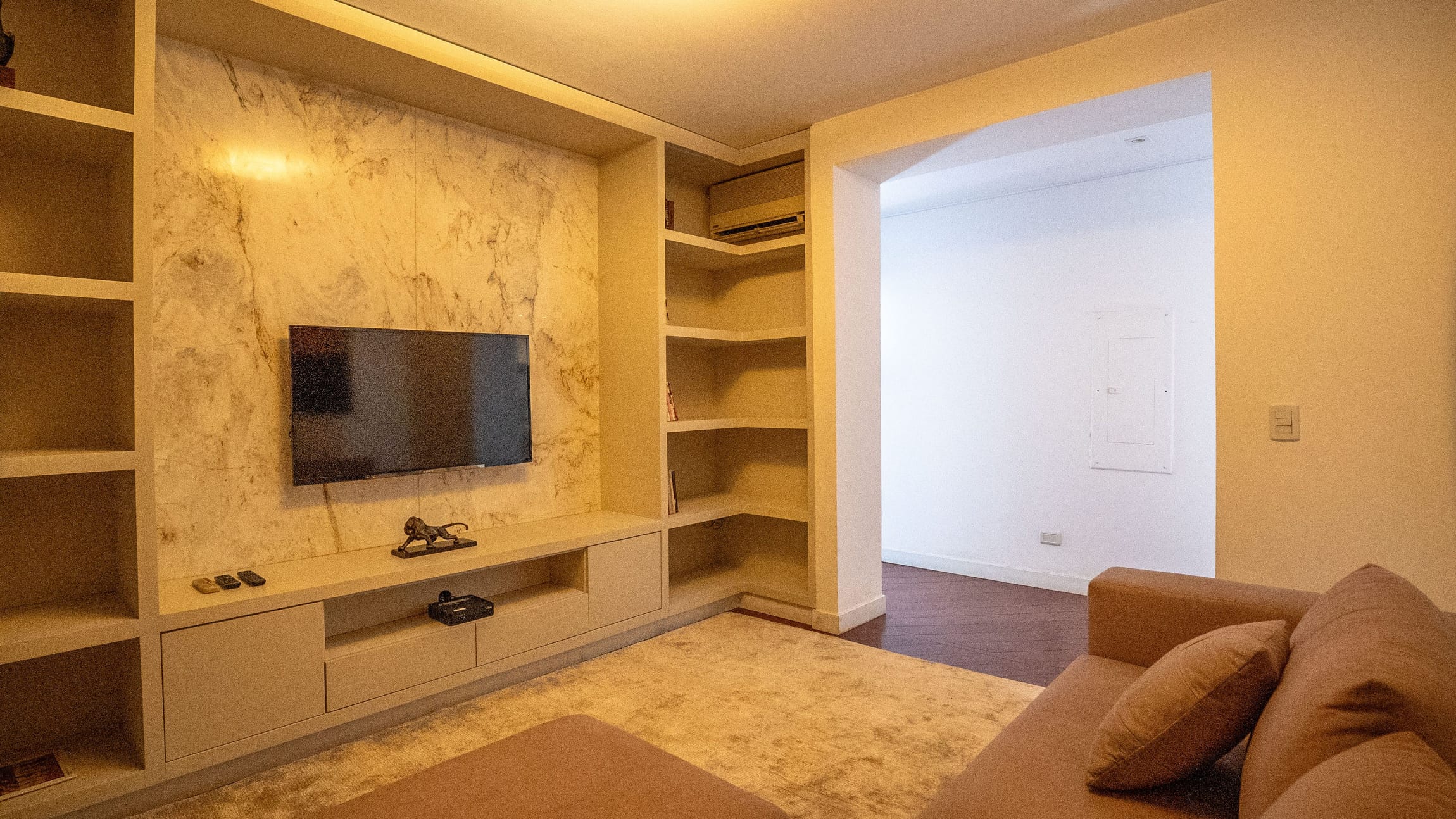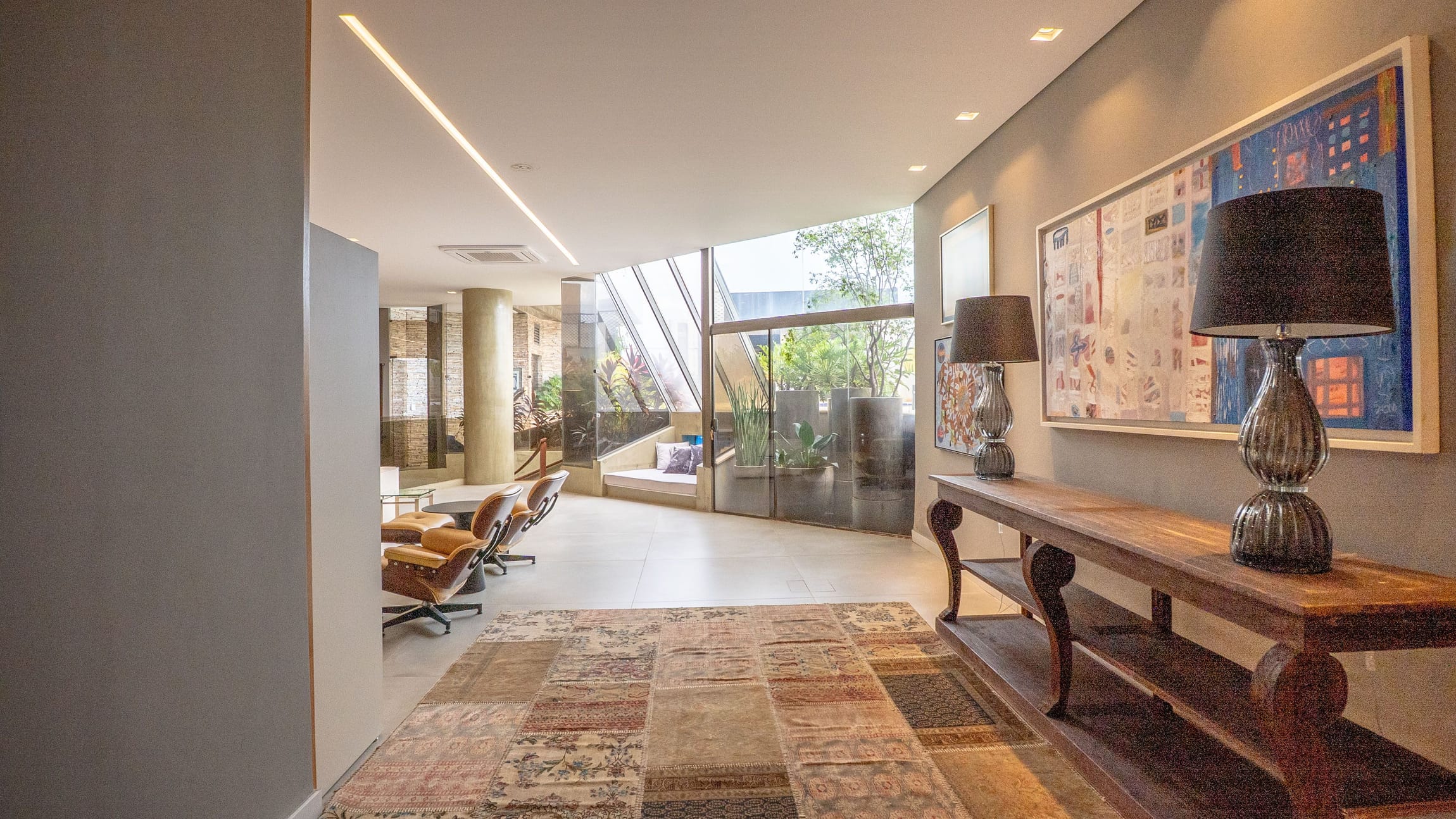 •	Sala para três ambientes com painéis ripados e adega climatizada;