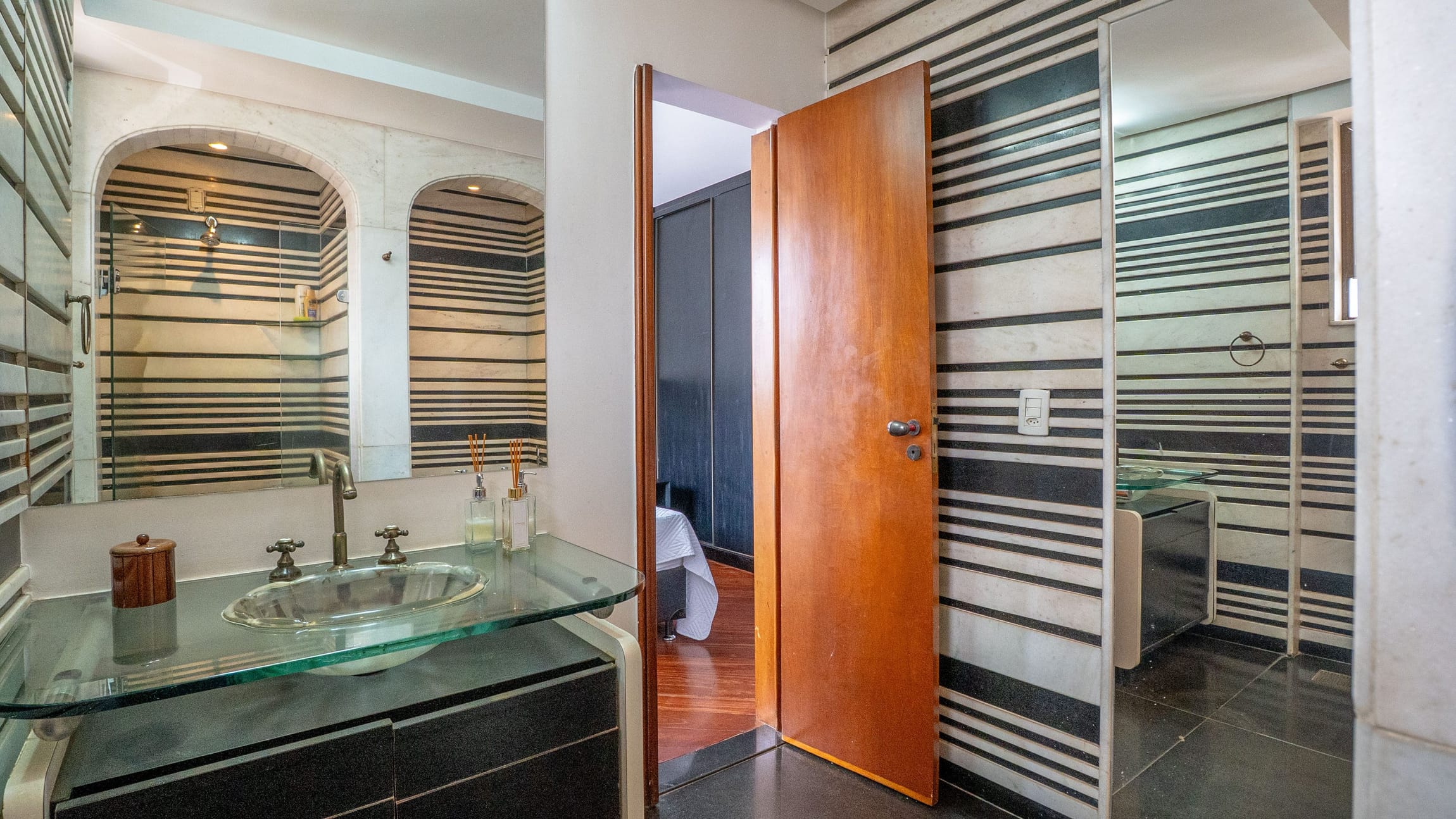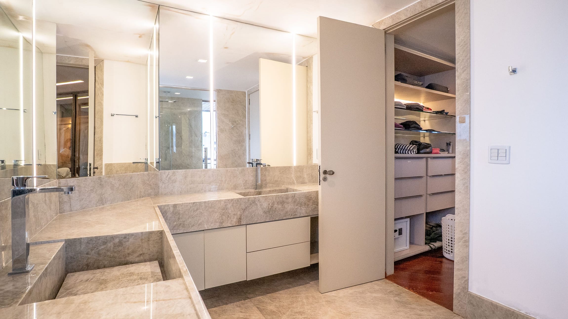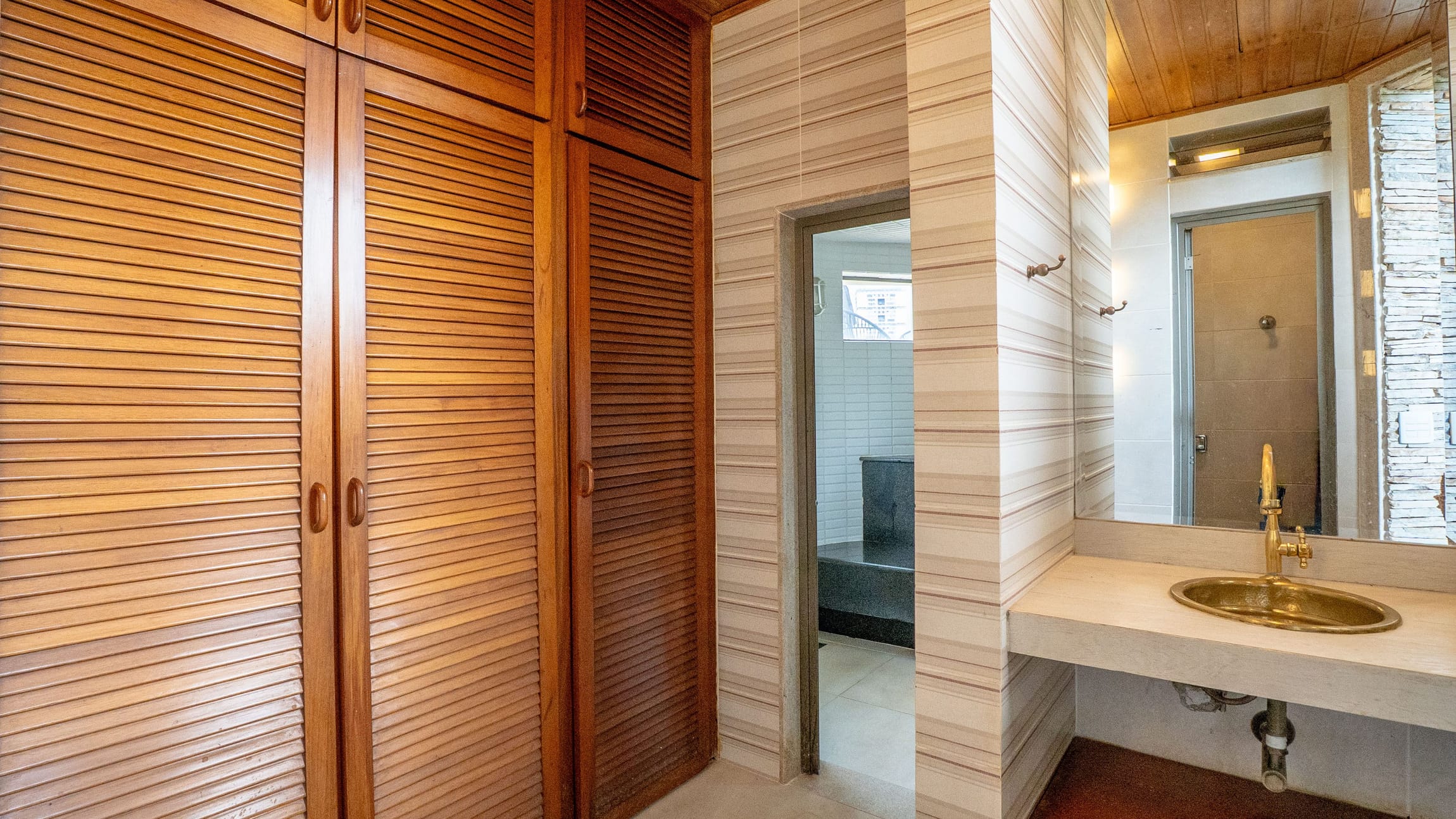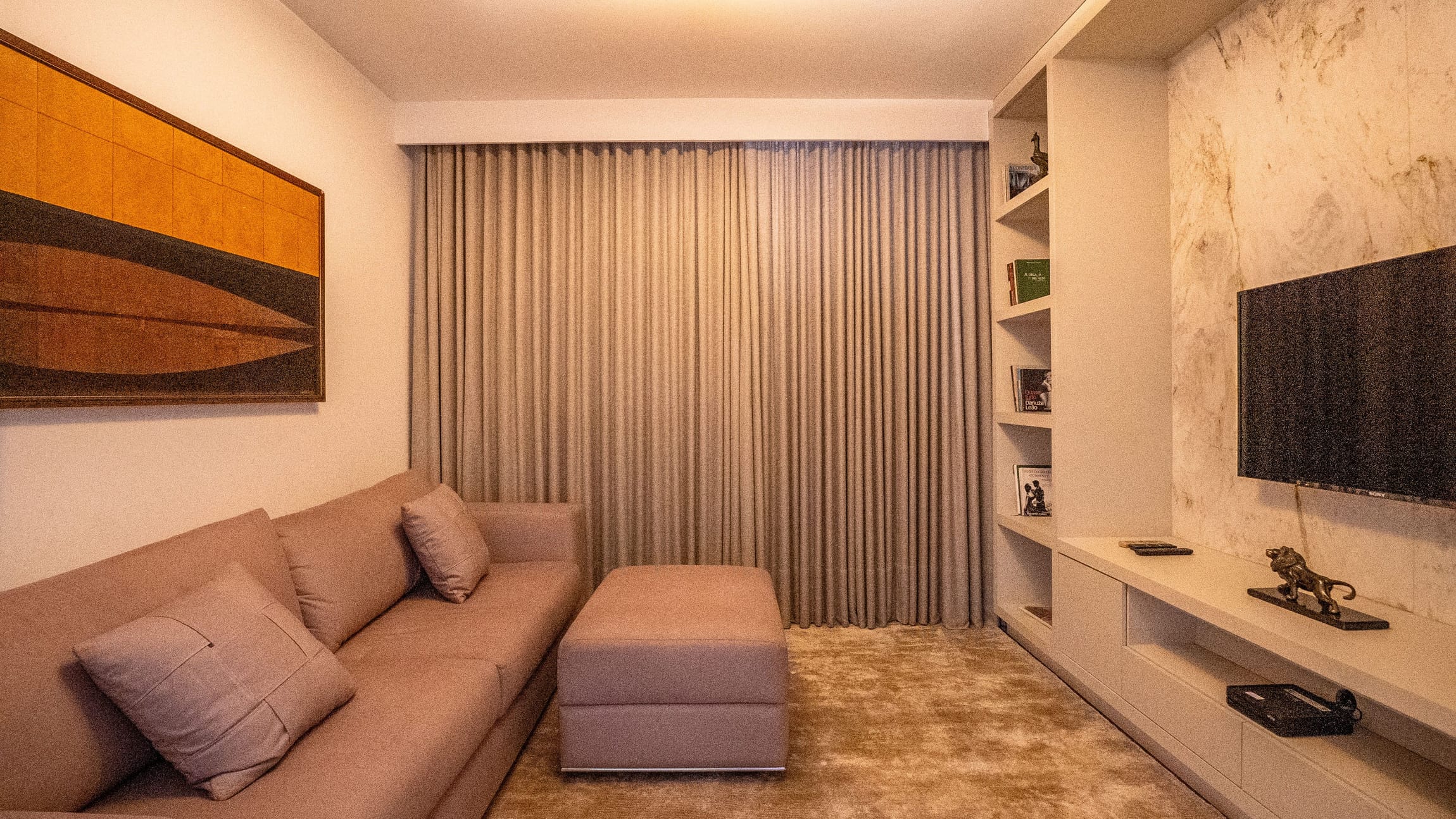 •	Sala para três ambientes com painéis ripados e adega climatizada;