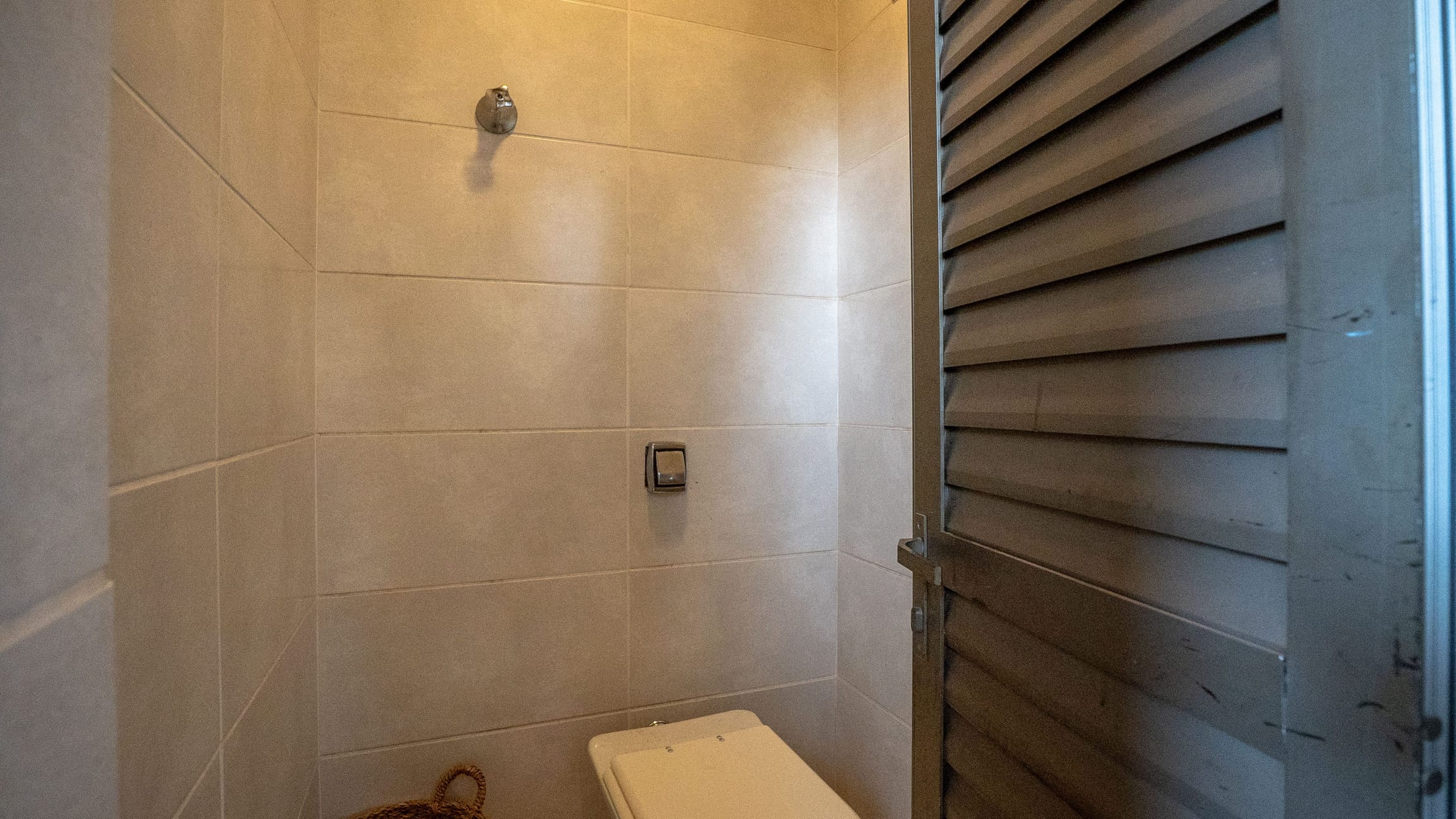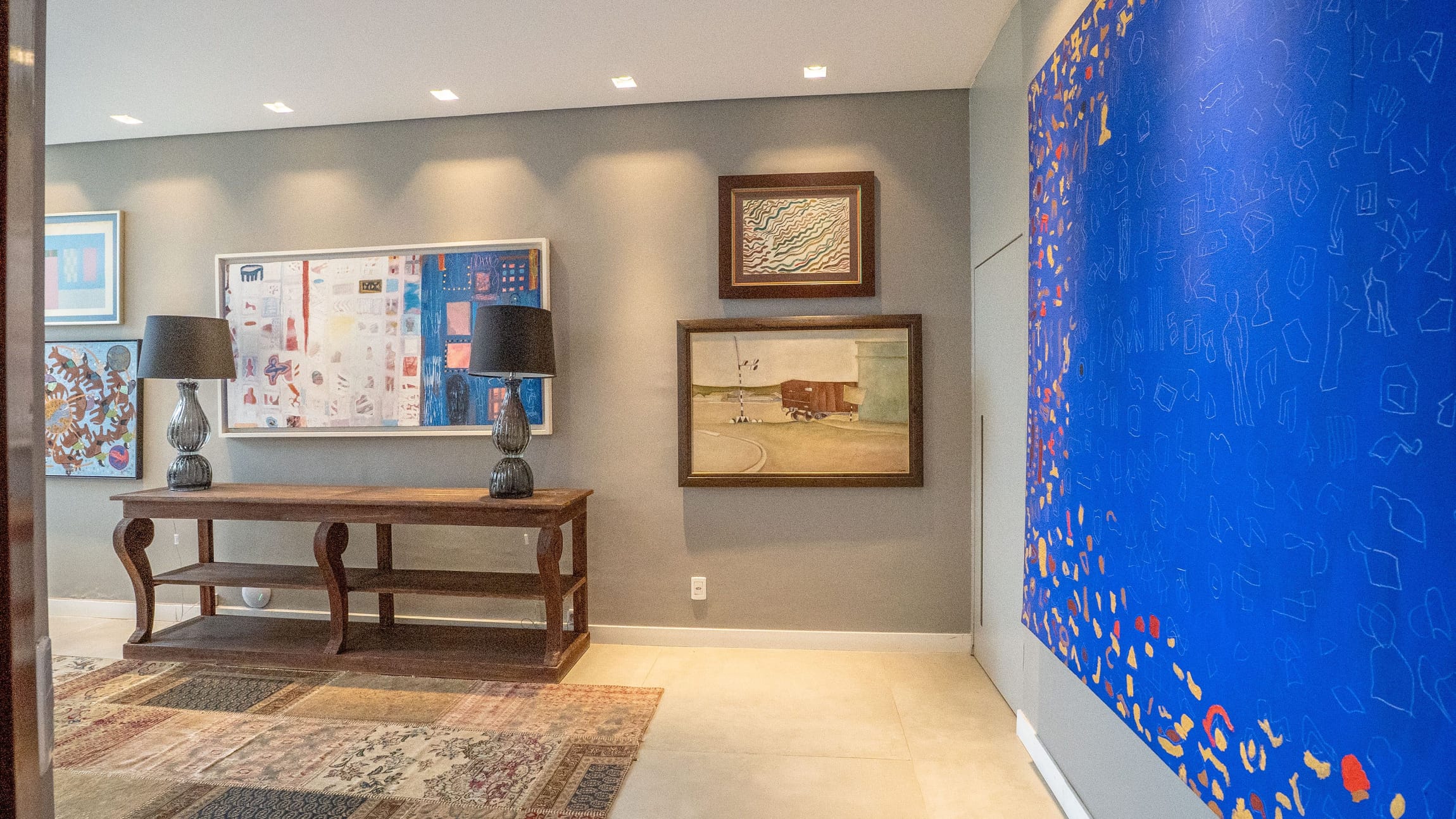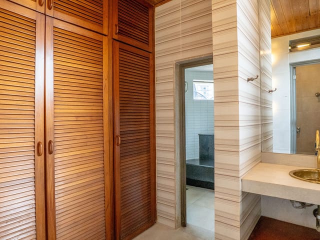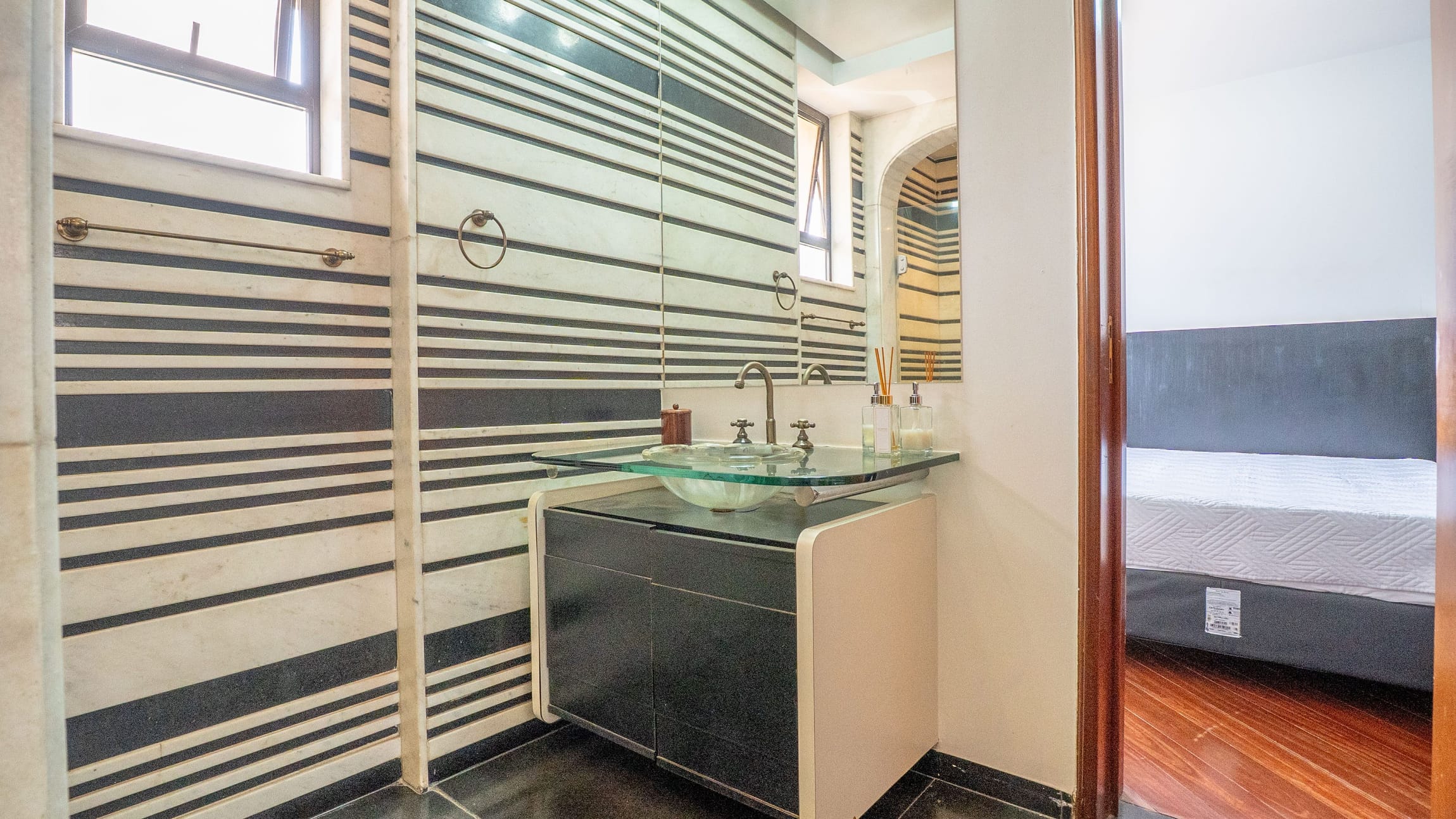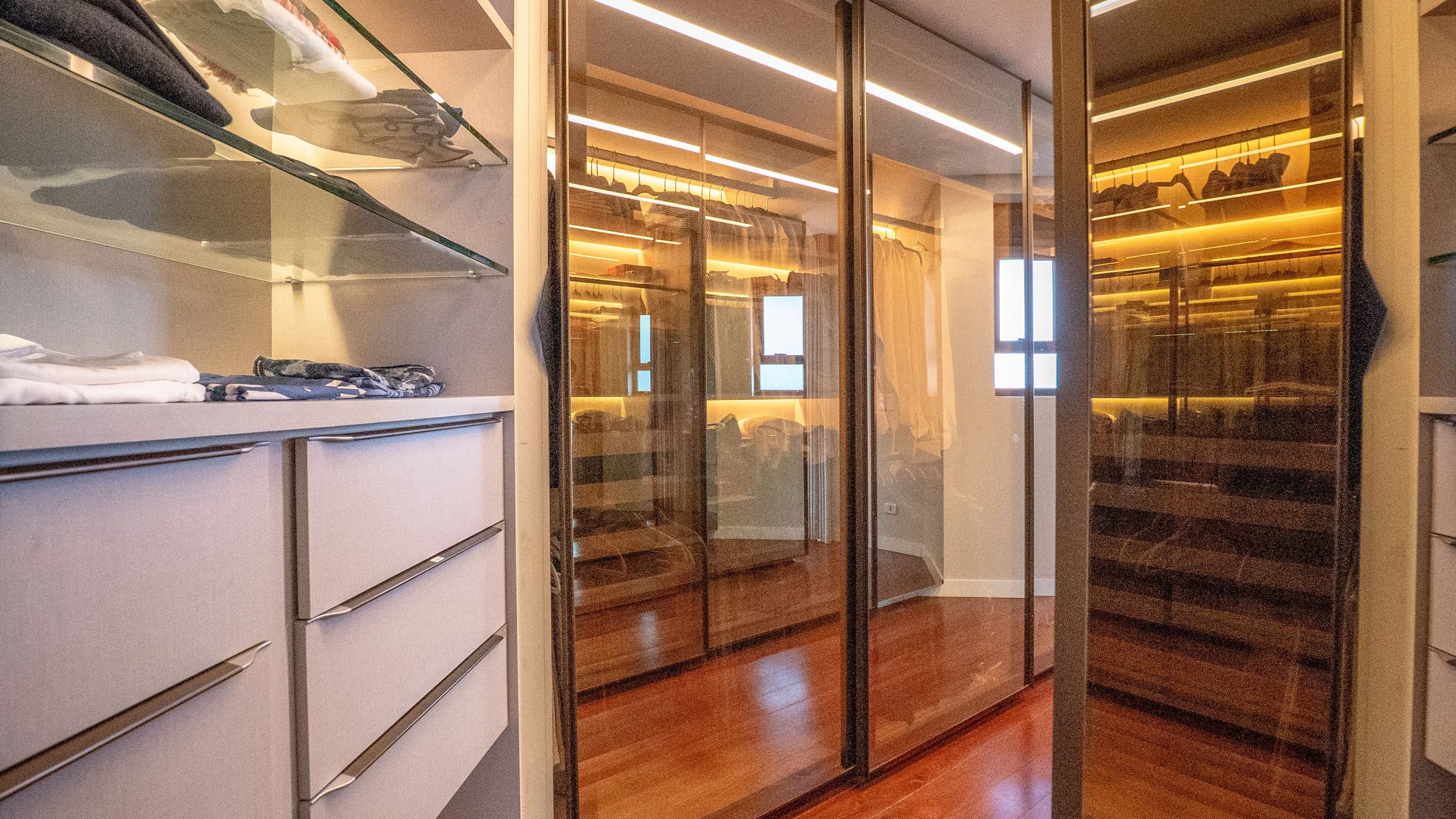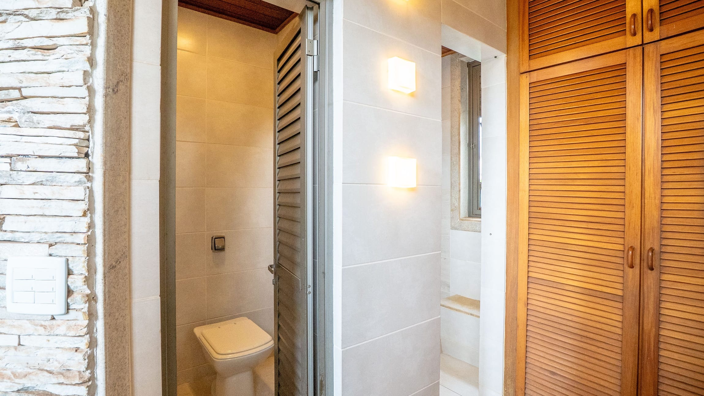 •	Sala para três ambientes com painéis ripados e adega climatizada;