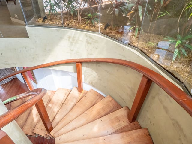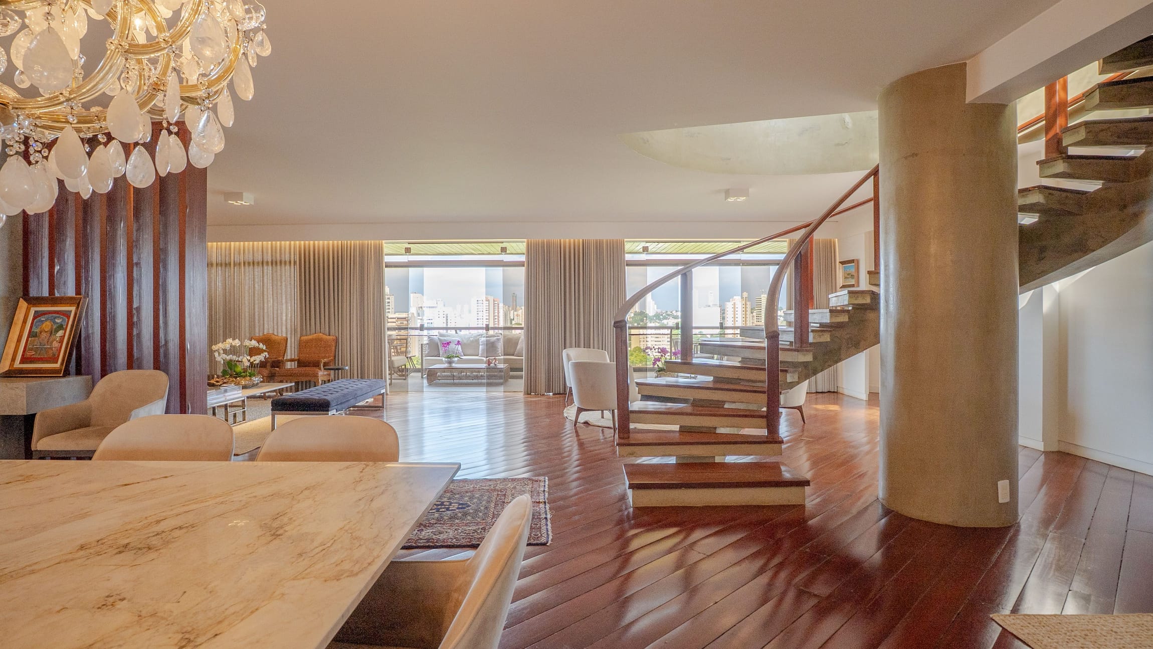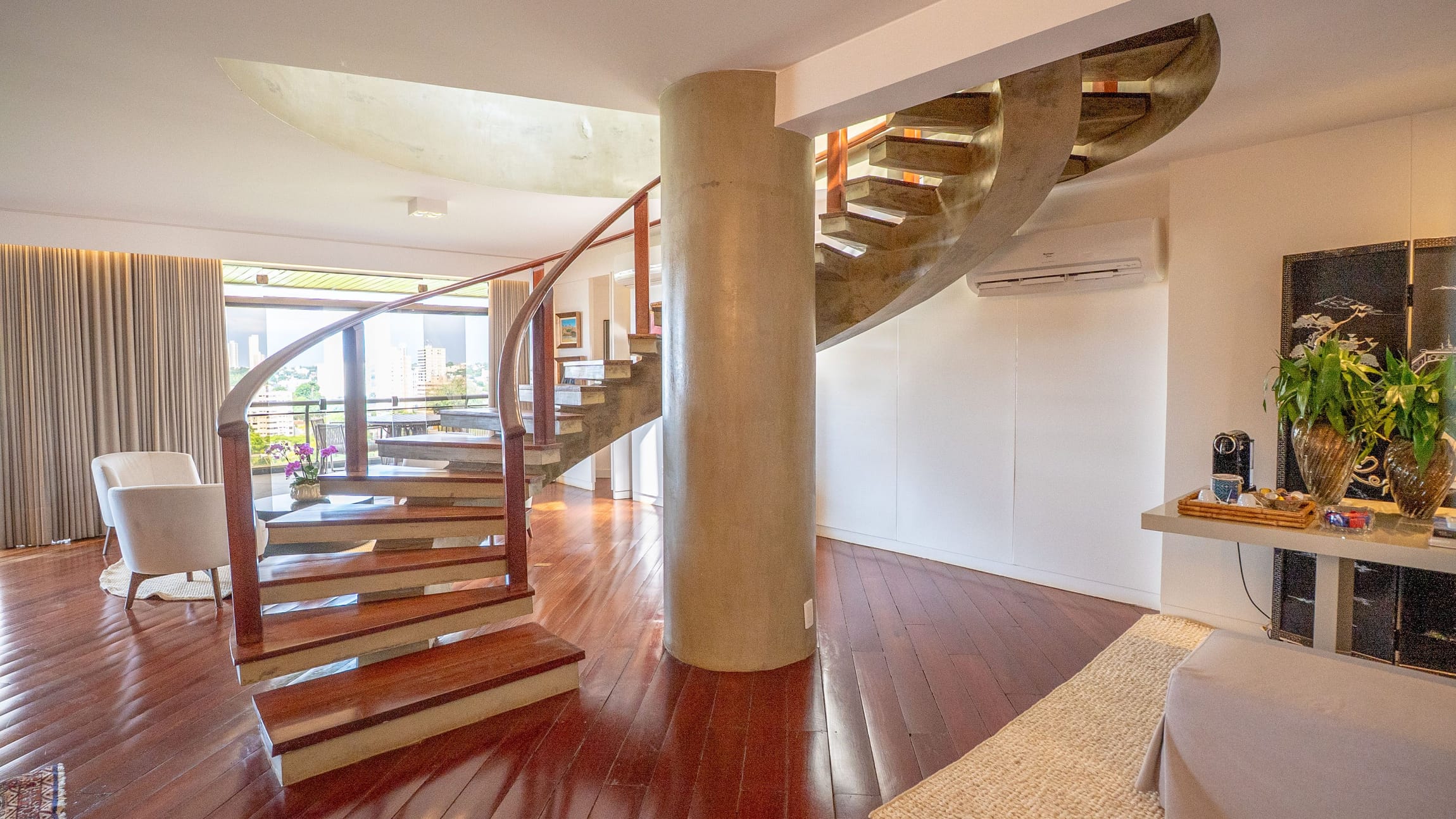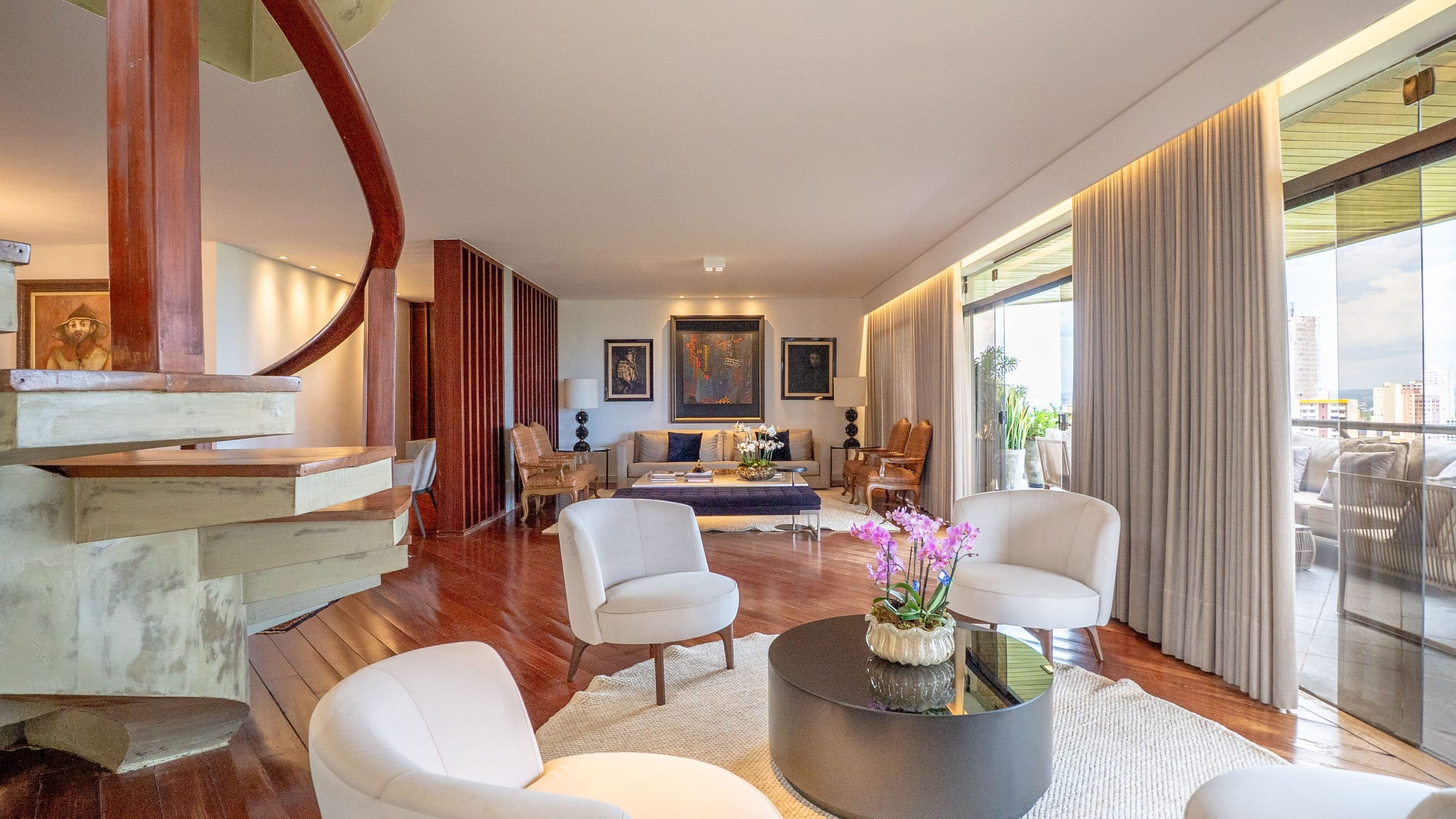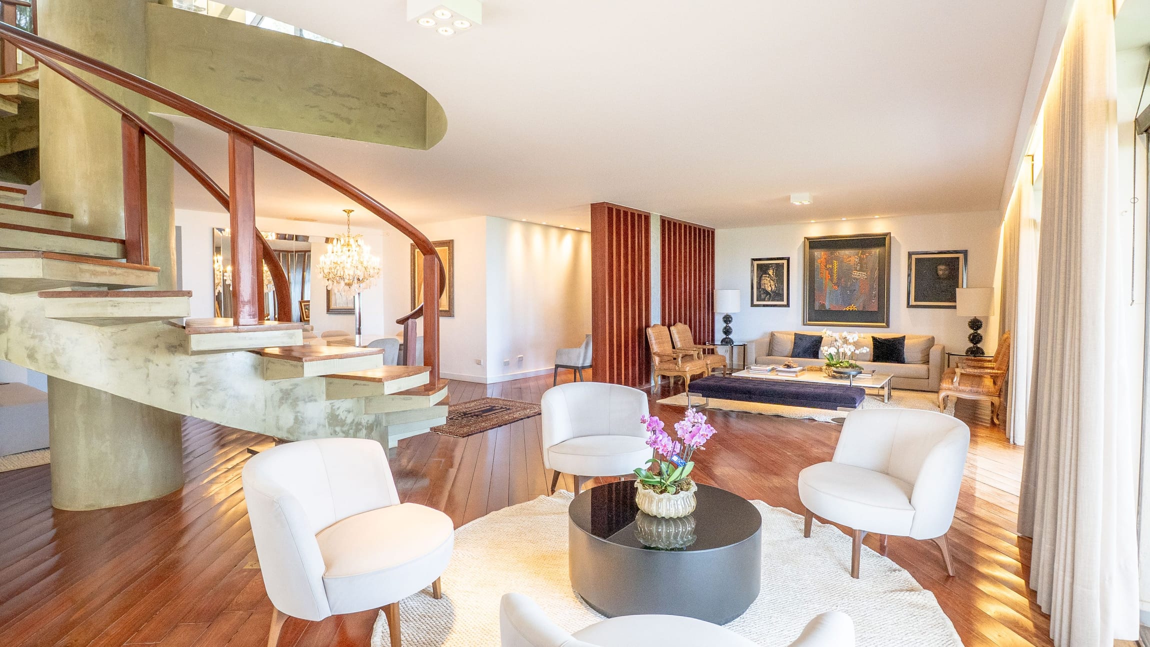 Um hall imponente com escada escultural em madeira maciça conduz à área íntima e social, composta por: