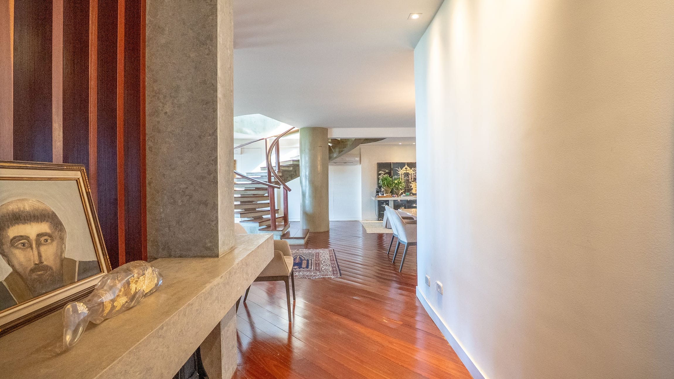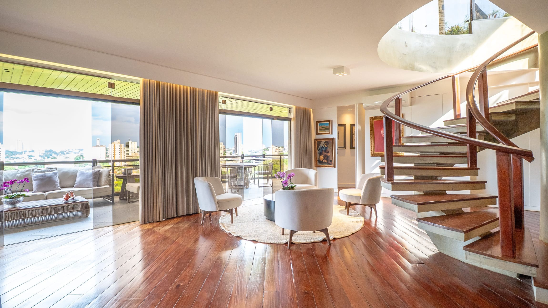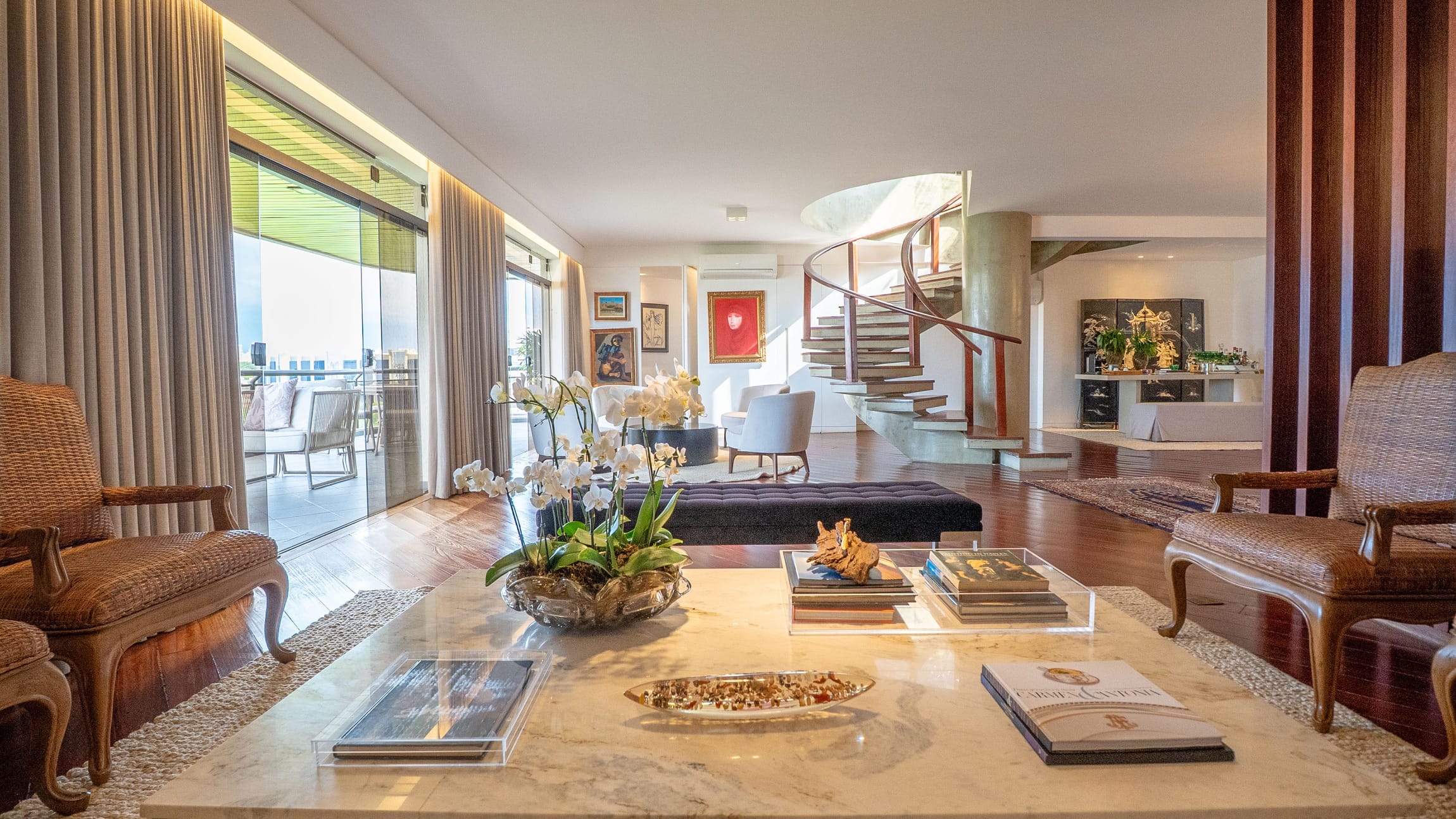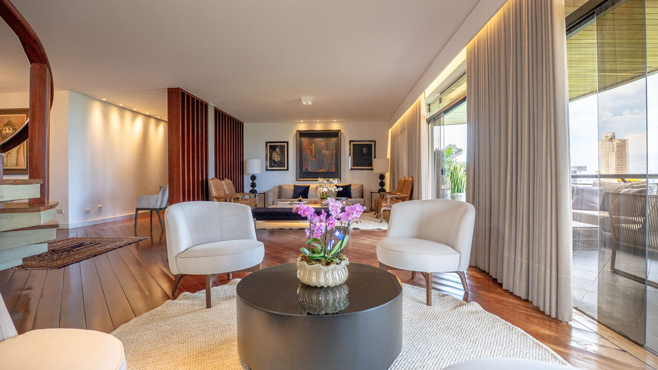 Um hall imponente com escada escultural em madeira maciça conduz à área íntima e social, composta por: