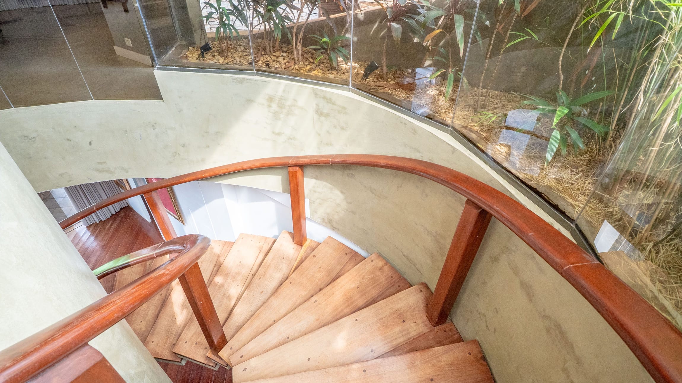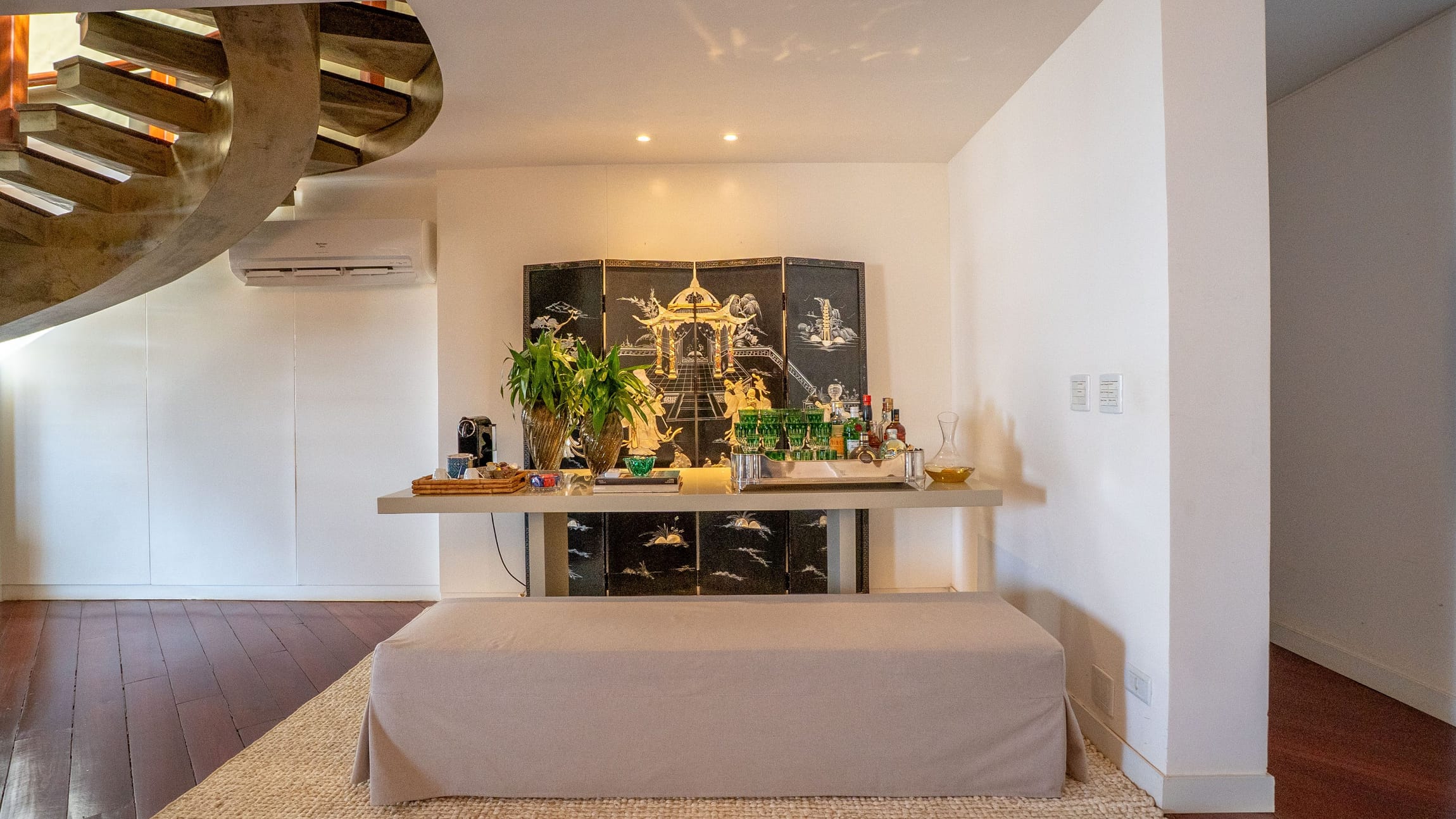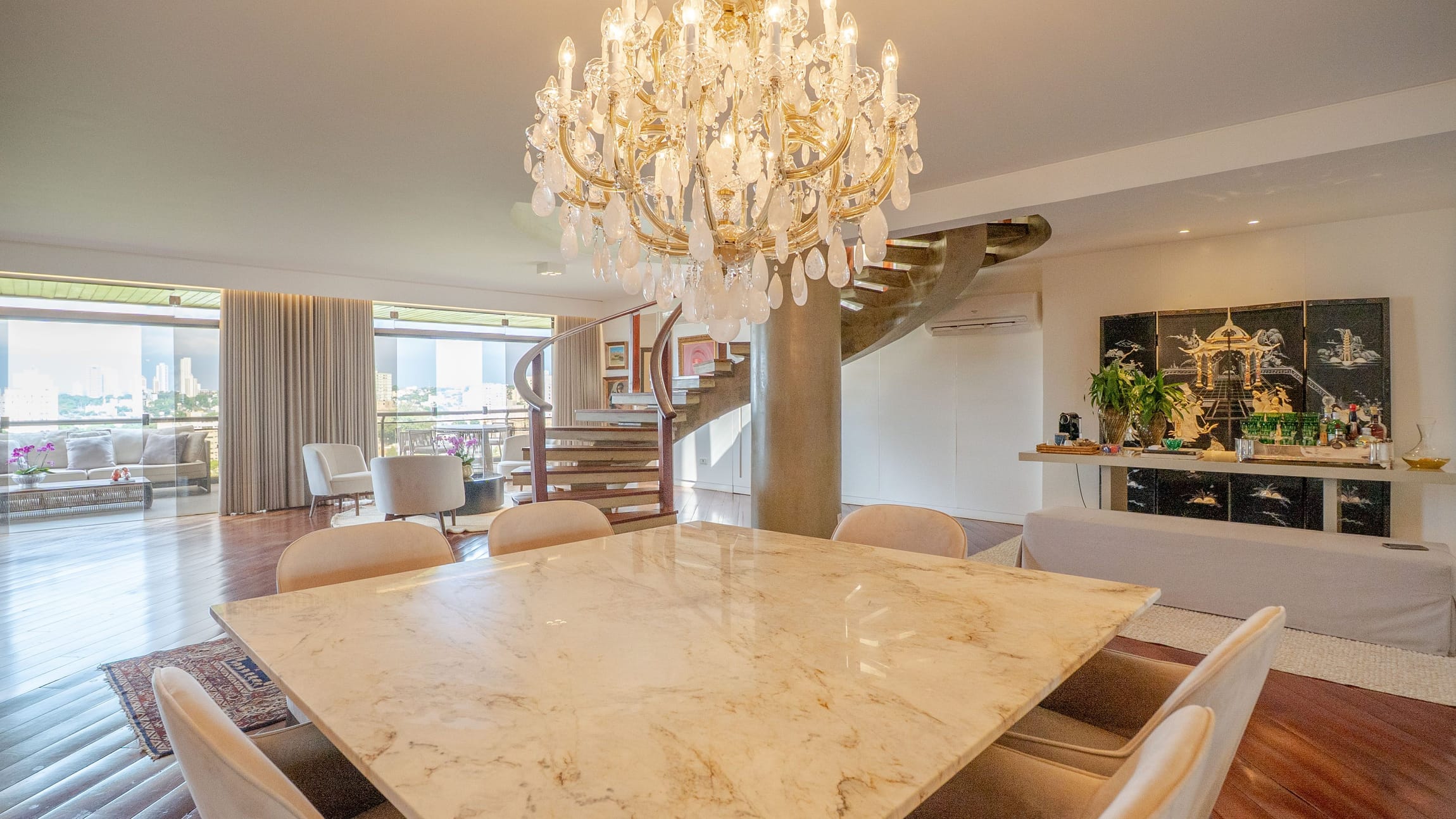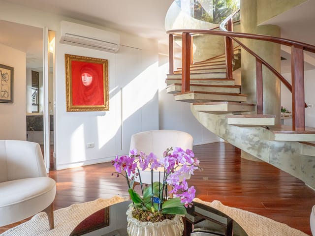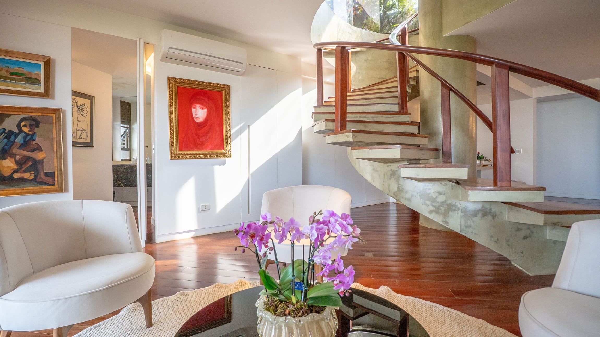 Um hall imponente com escada escultural em madeira maciça conduz à área íntima e social, composta por: